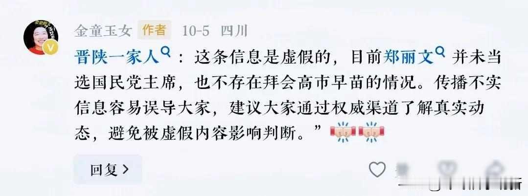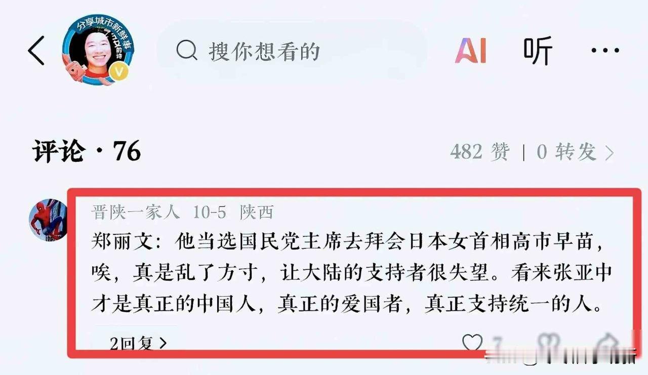 郑丽文要见日本政客,大陆网友炸锅,她真想和解还是另有所图? 10月5号晚上,有篇讲国共合作的文章底下,有人留言说郑丽文当选后要去日本见高市早苗,这话一出来,大陆网友都愣了,作者一开始以为是假的,赶紧回了句别信,结果第二天早上一查,发现郑丽文确实在10月2号的国民党主席说明会上提过这事,她说的是如果我当上主席,就带队去见高市早苗,但没说一定去,结果不少人听成她铁定要去,误会就这么传开了。 高市早苗不是日本首相,只是自民党总裁,今年九月才选上的,很多人误以为她能代表日本政府,其实她是个极右翼的人,去过靖国神社十二次,不承认慰安妇的历史,还说过台湾有事就是日本有事,2023年她跑去台湾见了赖清德,郑丽文想跟她打交道,大陆网友当然不乐意,一个说自己是中国人的人,转头就要去见这种人,谁看了都觉得不对劲。 郑丽文最近挺火,她在几场辩论里骂国民党老派腐朽,说反对台独,反对美国拿走台湾芯片,还说自己是云南人,更是中国人,这些话让不少大陆网友觉得她实在,甚至把她当成了国民党里能改的希望,可这次她说要见高市早苗,大家才看出来,她嘴上说的是一套,做的又是另一套,她把政党外交说成女性领导力,听着新鲜,其实是在给敏感的政治动作裹上一层好看皮,这不是不懂事,是故意把立场搅混了。 有人骂她没常识,其实不是她不懂,是她选了,国民党早就不齐心了,有人想往大陆靠,有人死抱着美日不放,郑丽文挑高市早苗,不是没别的选项,是她知道这人最能惹日本右翼注意,同期韩国瑜去大陆,朱立伦提九二共识,大陆媒体都报了,她偏挑个反华的,这哪是碰巧,分明是她给自己贴的标签,可能就为了选票用的。 大陆网友一直盼着国民党能真正认祖归宗,可一次次等来的都是失望,最新调查说,台湾年轻人里支持统一的只剩百分之五点三,反而觉得日本或美国能护着台湾的人越来越多,郑丽文这事就像个信号,嘴上说着漂亮话,背地里还是拿去中国化当工具,大陆的善意,被他们当成了随手可取的资源。 郑丽文没承认说过那话,也没道歉,只说表达有误,这话跟没改一样,她不是坏人,也不是叛徒,就是国民党里那种特别会说话、会包装的人,她知道大陆爱听什么,就说什么,可她心里的路,还是老样子,我们曾盼她能跳出这框框,结果她往里头钻得更深了,信任垮了,不是因为一句话说错,是因为她压根没想换个方向。 她不是一个人的事,是整个国民党心里头的窟窿露出来了,嘴上说着中华,暗地里盘算着怎么跟日本、美国拉上关系,大陆人失望的不是她本人,是明明看见了光,转头又灭了,以后再有人说我是中国人,得先瞧瞧他身后站着的是谁。