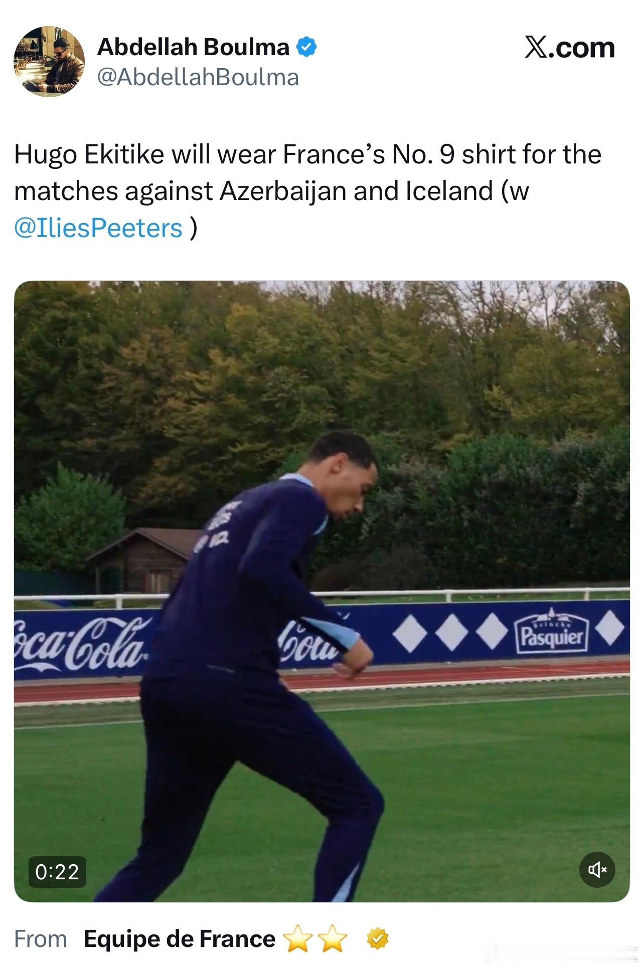 埃基蒂克将在这个国际比赛日法国对阵阿塞拜疆和冰岛的比赛中身穿9号球衣