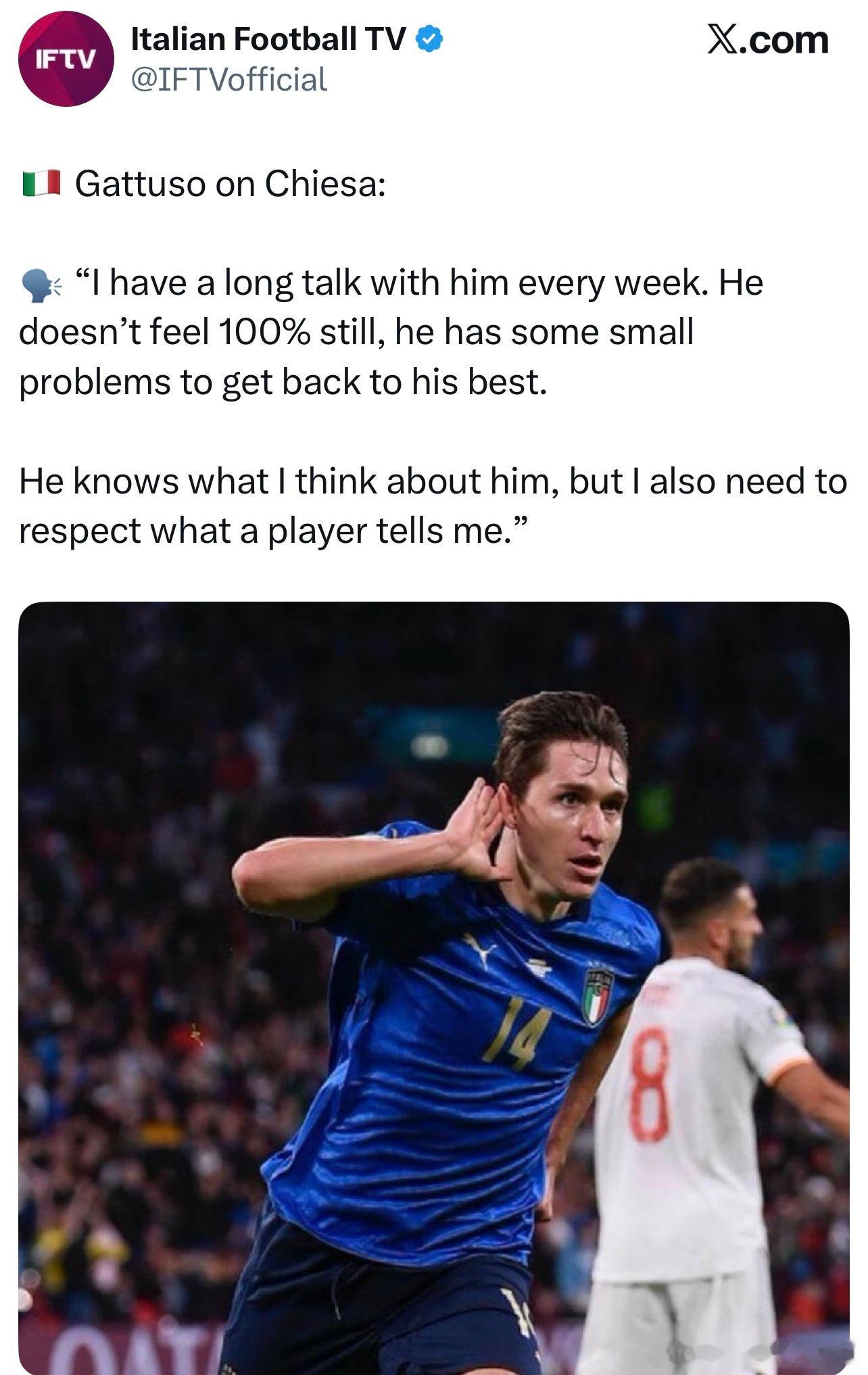 加图索谈基耶萨:我每周都会和他进行一次长时间的沟通,他感觉自己还没有100%恢复,在恢复到自己的巅峰状态之前还面临着一些小问题。他知道我对他的看法,但我同时也需要尊重球员的想法。