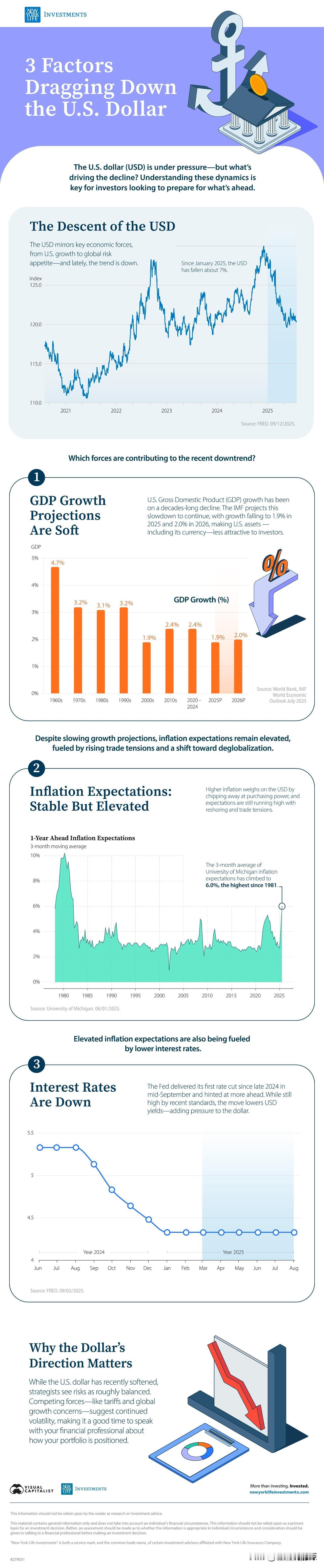 拖累美元走势的三大关键因素是什么? 美元(USD)正面临压力——但是什么导致了这种下跌呢?了解这些情况对于那些希望为未来做好准备的投资者而言至关重要。 这张图表是为近期美元的疲软状况提供了直观的背景信息。该图表还探讨了导致这一趋势的三个关键因素。 ——美元的贬值 美元常常被视为全球经济的晴雨表,它能反映从国内经济增长前景到国际投资者情绪等方方面面的情况。 然而,近来美元的走势出现了下滑的态势。自年初以来,美元已下跌约 8%。 决定一种货币相对强势程度的因素有很多。下面,将探讨其中起作用的三种力量。 1. 国内生产总值增长预测较为保守 美国的国内生产总值(GDP)增长趋势已持续数十年呈下降态势。根据世界银行的数据,从 2020 年到 2024 年,该国经济的年平均增长率仅为 2.4%。 展望未来,国际货币基金组织预计这种经济放缓态势将持续下去,预计 2025 年的经济增长率将降至 1.9%,而 2026 年仍将维持在 2.0%的较低水平。经济增长动力的减弱使得美国资产(包括美元)对全球投资者的吸引力降低。 2. 通货膨胀预期:稳定但处于高位 较高的通货膨胀率削弱了美元的购买力,而且由于本土化生产趋势和贸易紧张局势,市场预期仍处于高位。 密歇根大学公布的 3 个月平均通胀预期指数已升至 6.0%,这是自 1981 年以来的最高水平。 3. 利率下降了 美联储上周宣布了自 2024 年末以来的首次降息,将利率下调了 0.25 个百分点,并暗示未来还可能进一步降息。这一举措反映出人们对经济增长放缓和就业市场疲软的担忧日益加剧。 尽管美国的利率水平仍高于近期的平均水平,但此次降息使得以美元计价的资产吸引力下降,从而给美元汇率带来了新的下行压力。