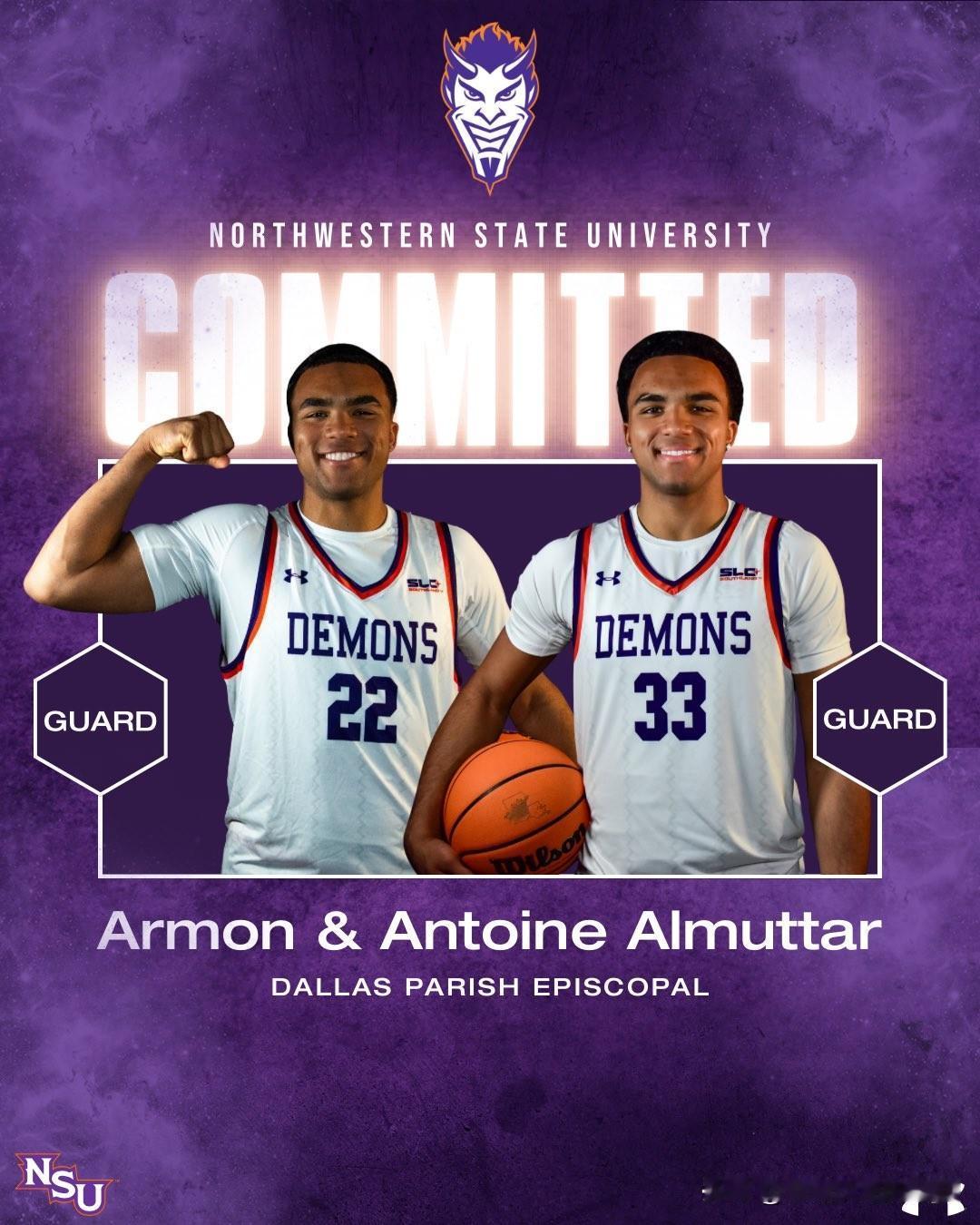 双胞胎后卫Armon Almuttar与Antoine Almuttar宣布承诺NCAA男篮 西北州立Northwestern State,身高6-4=193,高中就读于德州Parish Episcopal,来自达拉斯,球队这届收到的前两位加盟者。