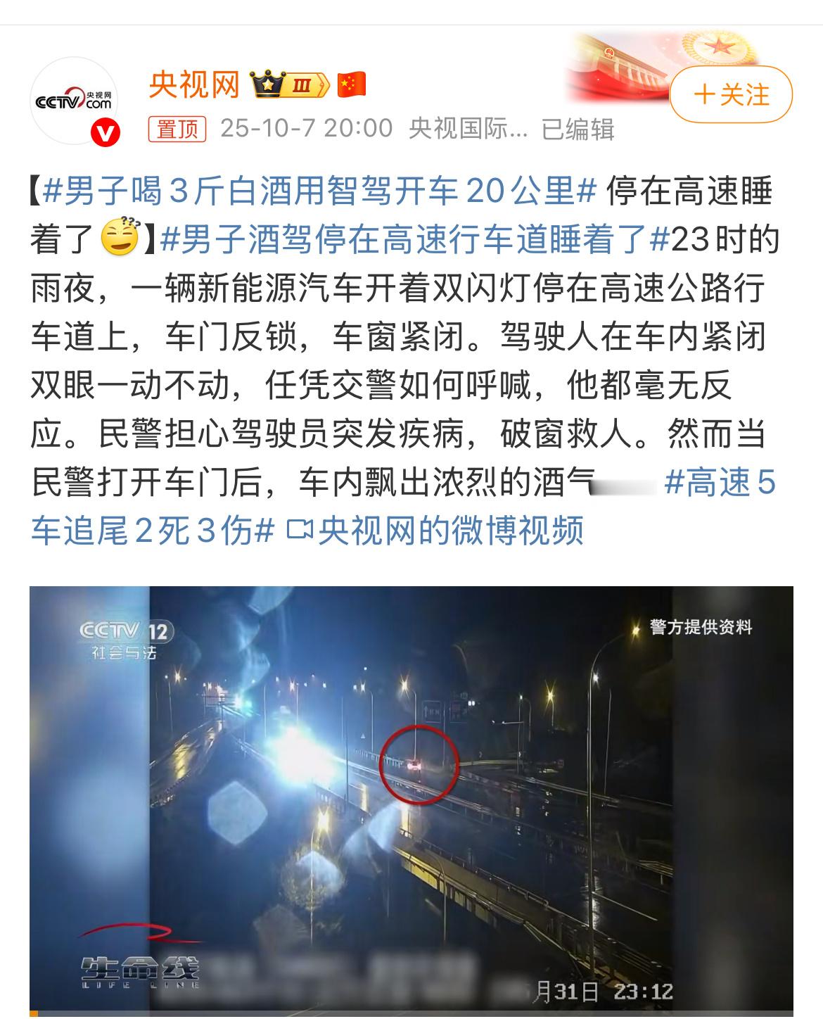 男子喝3斤白酒用智驾开车20公里2025年5月,姜某在杭州饮用3斤白酒后,开启智能驾驶功能在高速行驶20公里。途中因醉酒昏睡,车辆触发安全机制停在行车道中央。