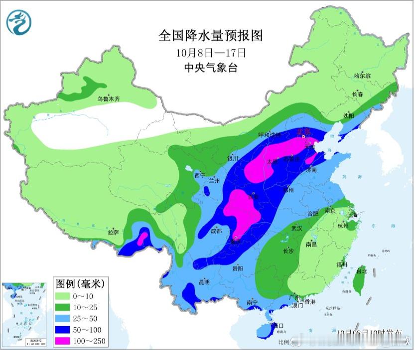 今后10天,副高继续偏强,降雨多寡不均。西北地区东部、华北、黄淮北部、四川盆地、湖北西部等地累计降水量有50~80毫米,部分地区100~150毫米,局地200毫米以上;上述大部地区降雨量较常年同期偏多7~9成,部分地区偏多1~3倍,我国其余大部降水偏少。