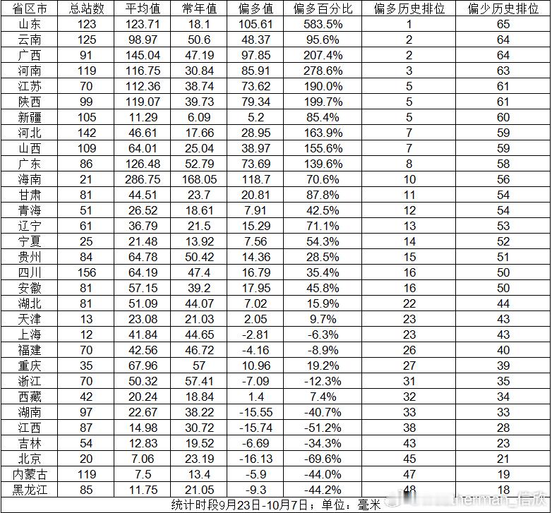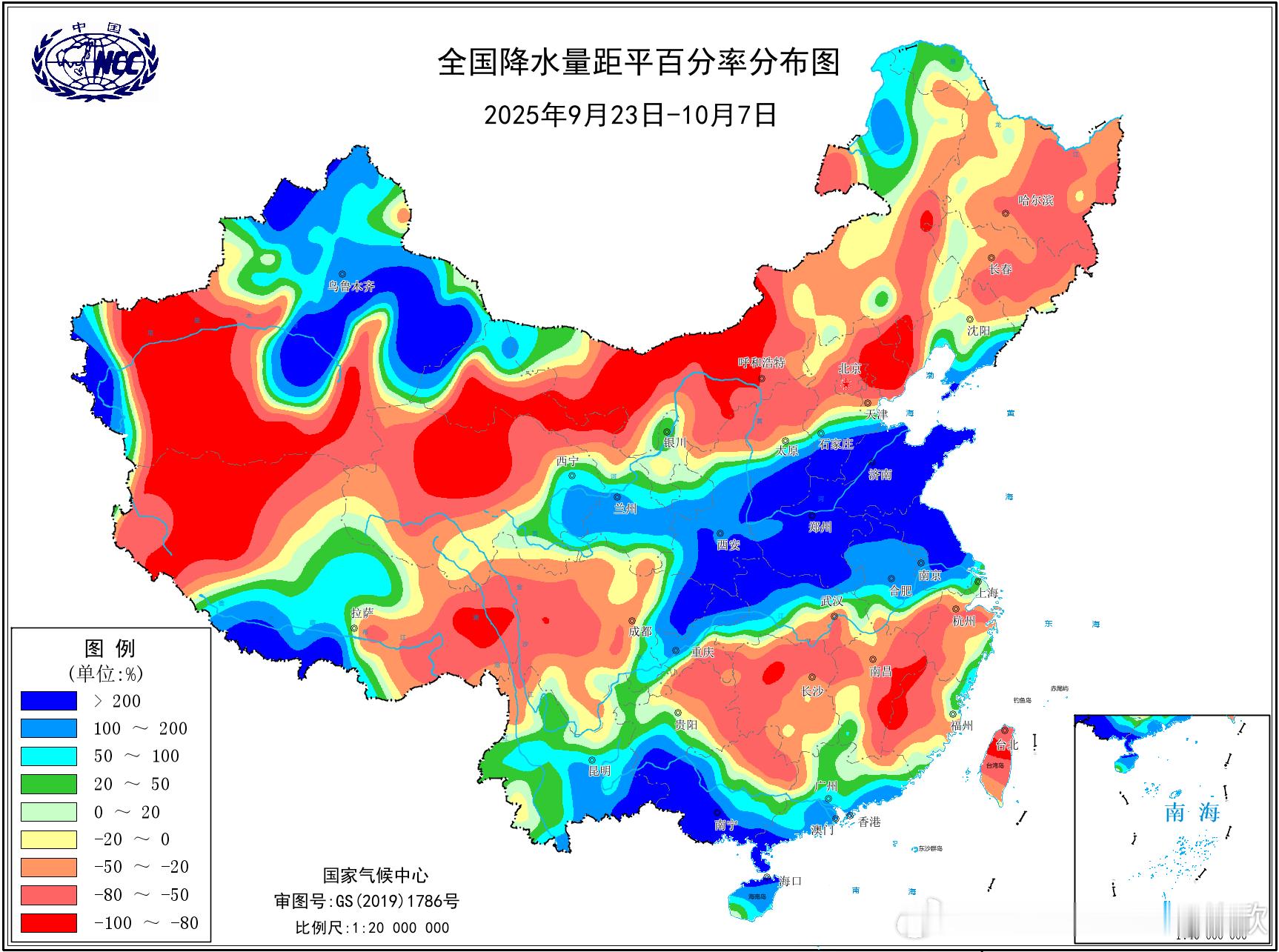 【多雨的秋分】今年秋分期间(9月23日-10月7日),全国面积加权平均降水量40.44毫米,大幅超常年同期的24.98毫米,为1961年有完整观测以来,降水最多的秋分。今年秋分因为副热带高压异常偏强,气温和降水双第一。而且降雨分布,多寡不均。多雨带沿着副高边缘。