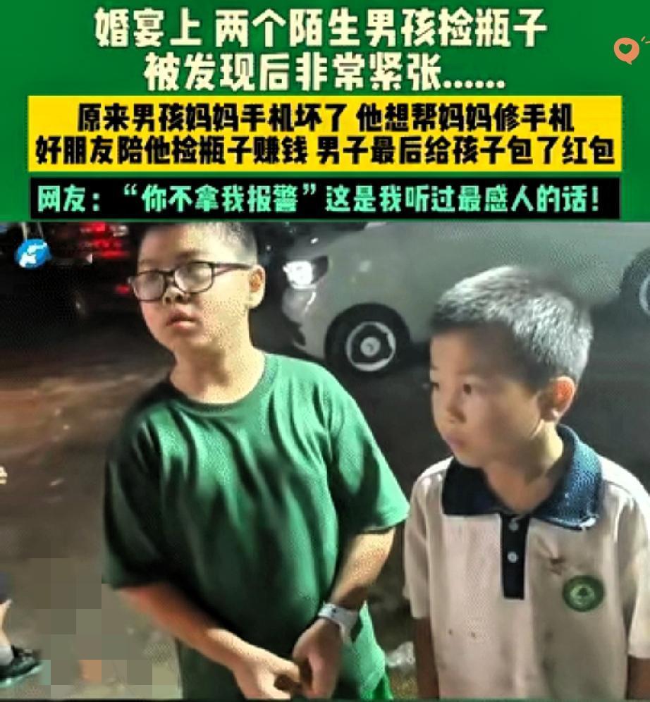 “你不拿我报警”居然成了最暖的话? 重庆婚宴上这俩小男孩和陌生大哥的事,看完真的忍不住鼻酸! 散场的婚宴里,俩娃东张西望不是贪玩,是想捡瓶子换钱—— 穿白衣服的娃要给妈妈修手机,绿衣服的同学就陪着他一起找。 可瓶子早被清走了,俩人只能空着手蔫蔫地走,这时大哥叫住他们要给红包,俩娃赶紧摆手拒绝。 没成想大哥急了,说“你不拿我报警”,才让俩娃笑着收下。 其实最戳人的不是红包,是大哥没戳破“施舍”的尴尬,用“强硬”护着孩子的自尊; 是小娃没吵着要玩具,把对妈妈的疼藏在捡瓶子里; 也是同学没嫌麻烦,陪着朋友一起努力。 这才是生活里的小善意,不刻意却超暖心。 你们平时遇到这种心软的小事,会像大哥这样搭把手吗? 或者见过比这更治愈的小瞬间?评论区说说呗!