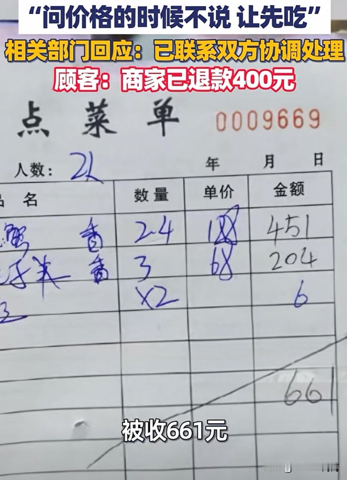 “又遇海鲜刺客”!10月6日,一游客杨先生将自己的遭遇发到了网上,称他在广东惠州炒蛏子和螃蟹两个菜花费661元! 餐厅奇葩的套路值得警惕,男子点餐的时候问价格的时候,餐馆老板不说,让先吃!没想到饭后一付账,顾客立刻傻眼了,简简单单两个菜661元! 10月7日,有记者联系当地相关部门,当地回应:已联系双方协调处理,游客杨先生也确认:商家已退款400元。 山东的网友:退400元,身为海边人,261元也觉得贵了。 湖南网友质疑:为什么要协调处理?不该处罚?福建网友回复:不协调你试试看能不能走出去[捂脸] 不少网友担心并好奇:为什么不曝光门店,难道要等下一位冤种上当受骗啊? 一位广东本地的网友自告奋勇给出了答案:8号渔船海鲜餐厅(小径湾店)[捂脸] 更让人哭笑不得的答案来了,另外一位广东IP的网友表示:还用曝光门店啊?惠州海边所有店几乎都一样。 我们作为旁观者也很纳闷,这都什么年代了还敢宰客?难道那些经营者不知道现在网络时代的威力吗?如果遭遇不公,一发到网上,比找当地“管家”灵验多了! 有些黑心商家总是抱着侥幸心理,他们对外地游客是能宰客一个是一个,卖着路边摊的货,暗中来个六星级酒店的收费!他们或许永远不明白一个简单的道理:诚信才能赢天下! 其实说白了,这样的消费陷阱还是处罚力度不够,应该明文规定,至少退一赔三!不然下次还会继续这种操作!某些景区卖海鲜餐饮的没有明码标价就是涉嫌欺诈,应该严肃规范处理这样的宰客违法行为!抓到一次重罚,只有让他们蛋疼一次,这样的现象才能彻底纠偏吧?! 该男子的遭遇又给我们其他围观的消费者和网友提了一个醒:以后去某些餐厅,一定要先确认好价格再下单,避免当冤大头给自己添堵。 参考来源:大皖新闻 炒蛏子和螃蟹两个菜花费661元