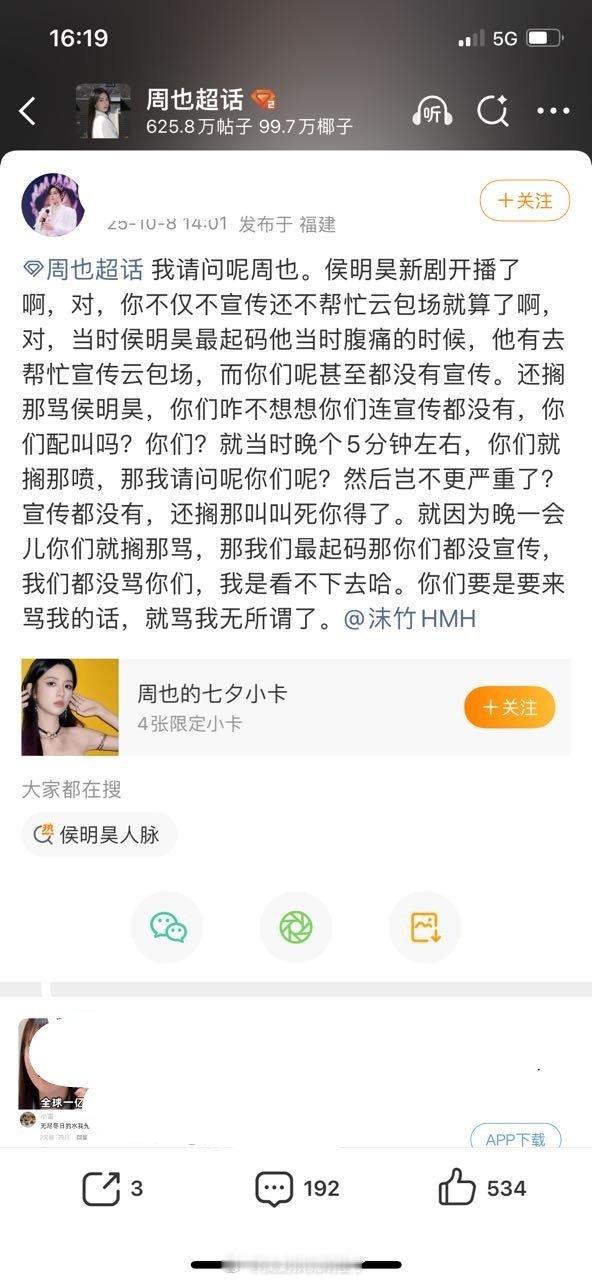 侯明昊粉丝去周也超话让周也给侯明昊新剧《入青云》包场和宣传