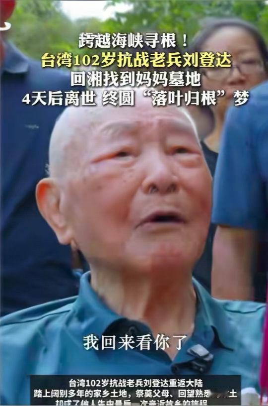台湾102岁湖南籍抗战老兵刘登达,时隔多年跨越海峡回到大陆祭祖。10月1日在返回台湾的路上,在福州转机时离世。 老人是1923年生在湖南岳阳临湘县的,家里就他和哥哥两个男丁。16岁那年抽壮丁抽到了已婚的哥哥,他二话没说就替兄从军,这一去就是一辈子的牵挂。 他跟着部队在湖南、湖北、江西一带打游击,卫山、新墙河都留下过他的足迹。那时候兵荒马乱,战士们连顿饱饭都吃不上,更别说给家里捎信。他哪里想得到,自己刚离开家乡,母亲就惨遭日军杀害。 1946年他随部队赴台,从此被海峡隔断。那些年他在台湾孤苦伶仃,膝下无子女,只能靠着微薄的抚恤金过活。夜深人静时,他总摸着褪色的军装袖口发呆,那里缝过家乡的粗布补丁。 1987年台湾开放探亲的消息传来,他凌晨3点就去红十字会排队领表。可等辗转回到岳阳,亲戚吞吞吐吐说出母亲的遭遇时,这个在战场上没掉过泪的老人,当场瘫坐在地上。 这次返乡是志愿者帮他圆的梦,他们找了大半年,才在一片竹林边找到他母亲的墓地。老人扶着墓碑反复摩挲,嘴里念叨“妈妈,我回来看你了”,眼泪砸在墓碑上都没停。 几十名亲人早就候在村口接他,还特意补办了百岁生日宴。他握着晚辈的手,把寿桃分给每个人,嘴里说着“好吃,比台湾的米糕香”。离开前,他在母亲墓前鞠了三个躬,说“下次再来看你”。 没人想到这会是他最后一次说话。他的离去看着突然,其实早有征兆——路上他一直摩挲着母亲墓地的照片,说“能再摸摸老家的土,值了”。 这哪是一个人的故事啊,当年几十万赴台老兵都这样。他们年轻时保家卫国,老了连回家见亲人都要拼尽全力。历史的隔阂把他们的人生撕成两半,很多人到死都没等到那声“回家”。 刘登达算是幸运的,10月6日,老人埋葬在他母亲的墓旁,永远陪着他的母亲。那些至死没踏上故土的老兵,才是真的遗憾。 各位读者你们怎么看?欢迎在评论区讨论。