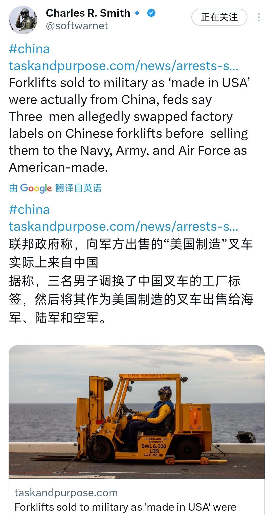 美国媒体报道,卖给美国军方的“美国制造”叉车实际上来自中国。据称,三名男子调换了中国叉车的工厂标签,然后将其作为美国制造的叉车出售给海军、陆军和空军。 [机智]评几句:这一幕要是再过几年出现,可能更能够让人理解,毕竟中国叉车目前还不是全球行业龙头。安徽叉车集团、杭叉集团和比亚迪叉车2024年的市场占有率分别排在全球第7、第8和第16。全球叉车市场呈现“头部集中、中国崛起、电动化加速”的趋势,但是丰田工业(第1)和凯撒集团(第2)还是占有最大的份额,尤其是丰田工业。