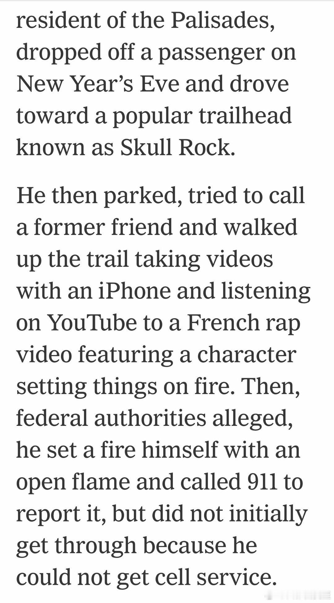 (接上条)加州Palisades大火的嫌犯,当时是本地居民(现搬至佛州),开Uber,新年夜,送完一个乘客,到附近山上,用手机听音乐,歌词内容是“点火”,他在周围点火,后来想报警,没信号