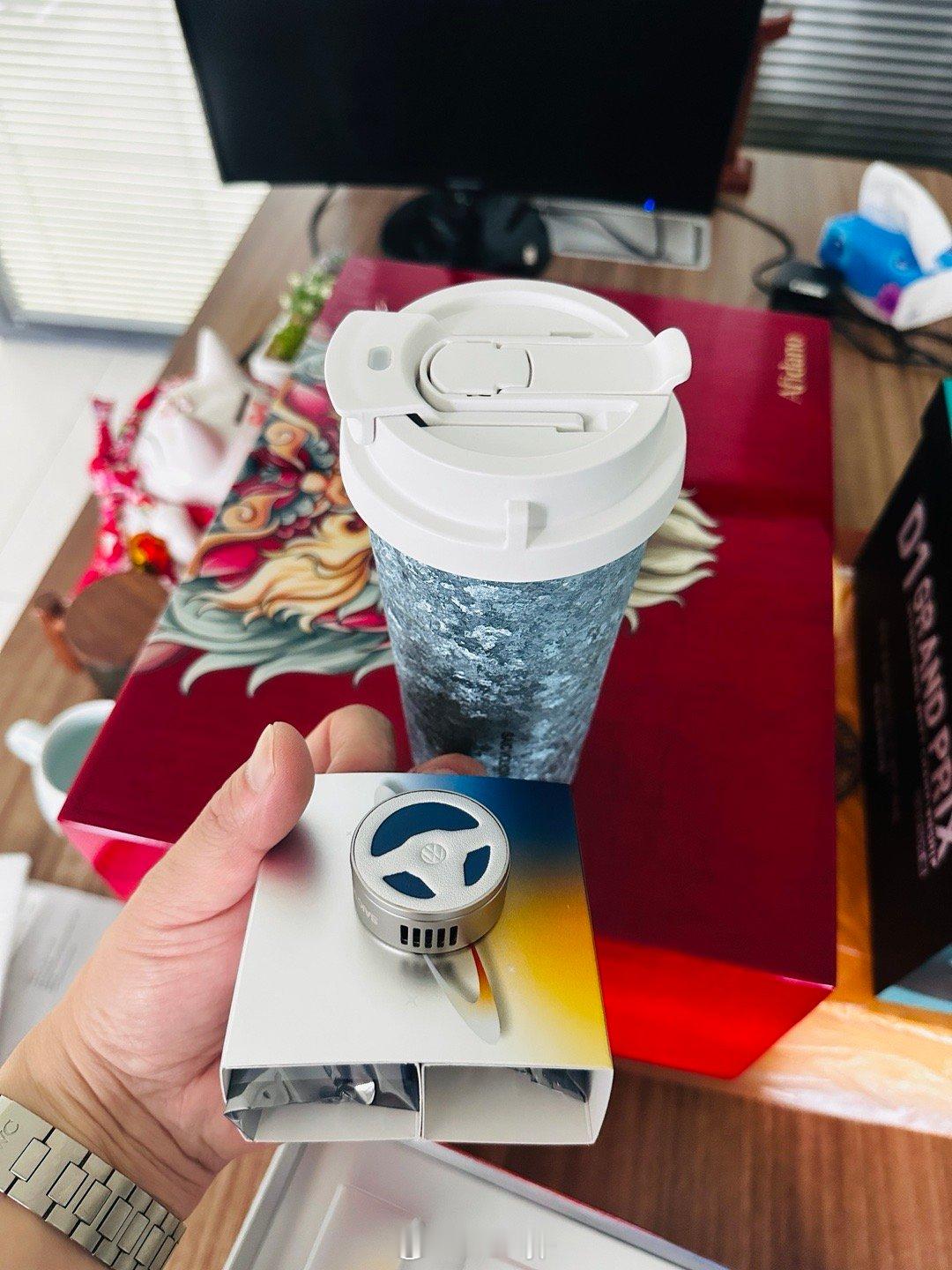 从国外回来第一天上班,办公桌上一堆快递,都给同事们分了,上汽大众这个可以啊,车载香薰,运动水杯,就差一辆GTS了[偷笑][偷笑][偷笑]