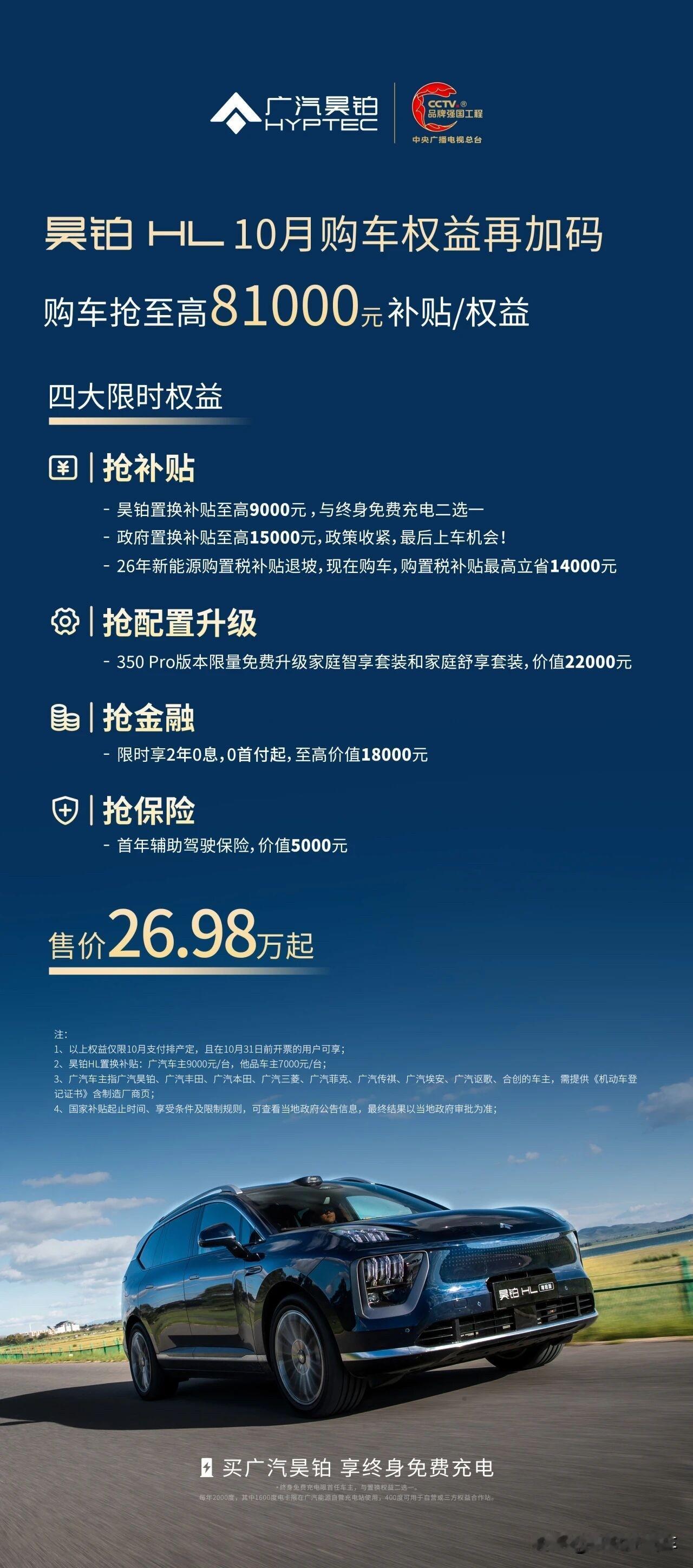 广汽昊铂HL十月购车权益再加码,抢至高81000元补贴/权益