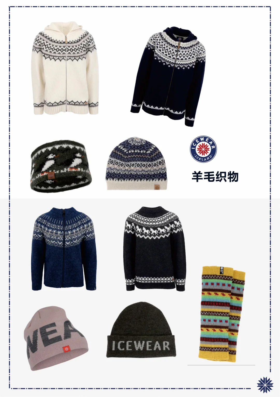 ❄️Icewear 诞生于 1972 年。最初,它因为传统冰岛羊毛毛衣而出名——那些带着独特花纹的毛衣,用百年工艺编织,是冰岛人抵御严寒的可靠伙伴。直到今天,Icewear 已不止于羊毛毛衣,它发展出了户外装备与旅行休闲系列:从防水外套、保暖羽绒,到一条简洁的羊毛围巾,每一件都延续着冰岛式的坚韧与纯粹