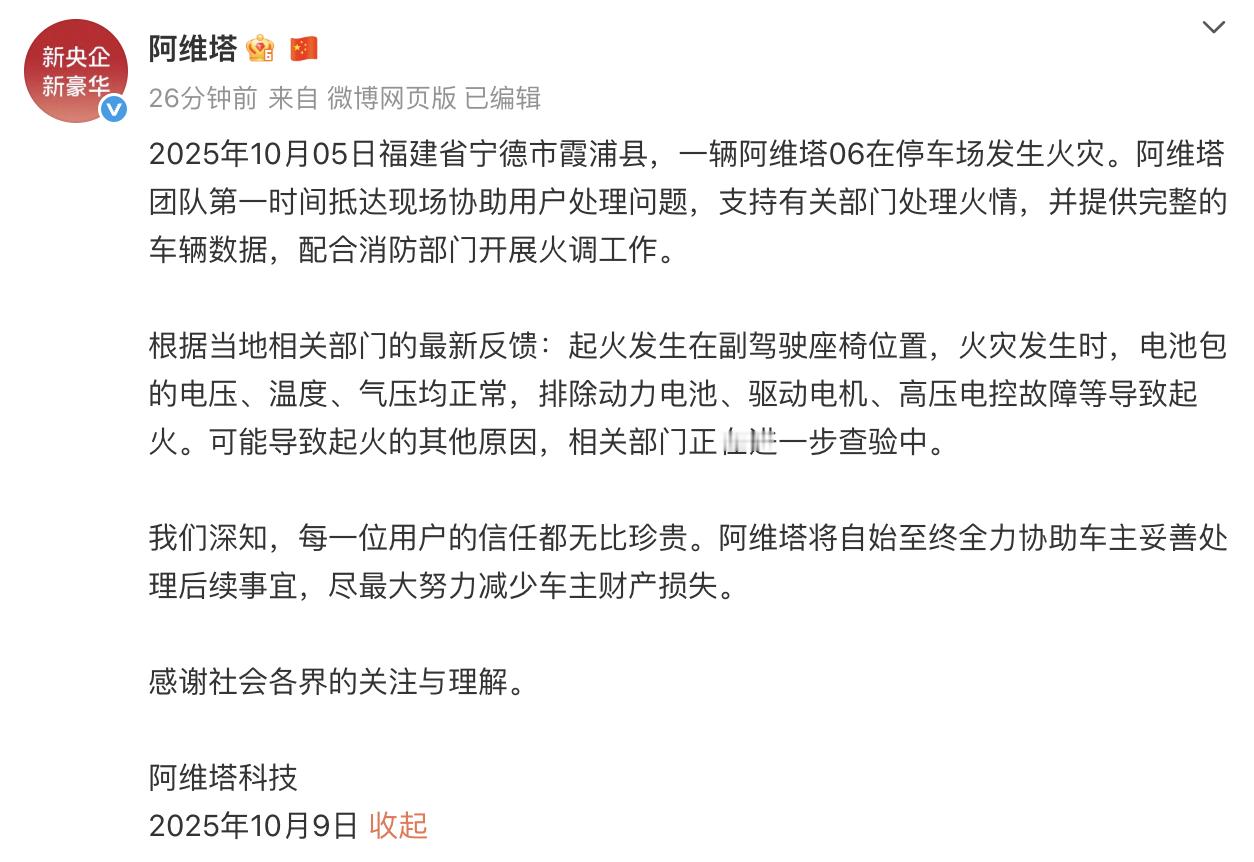10月9日,发布声明:2025年10月5日福建省宁德市霞浦县,一辆阿维塔06在停车场发生火灾。阿维塔团队第一时间抵达现场协助用户处理问题,支持有关部门处理火情,并提供完整的车辆数据,配合消防部门开展火调工作。