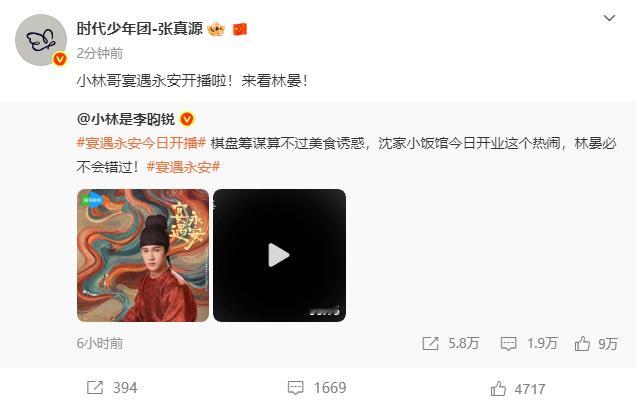 张真源为李昀锐新剧做宣传:小林哥宴遇永安开播啦!来看林晏!