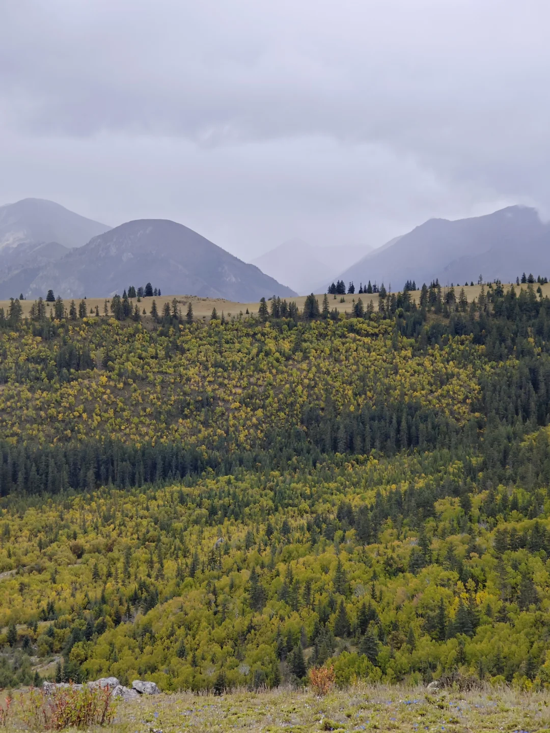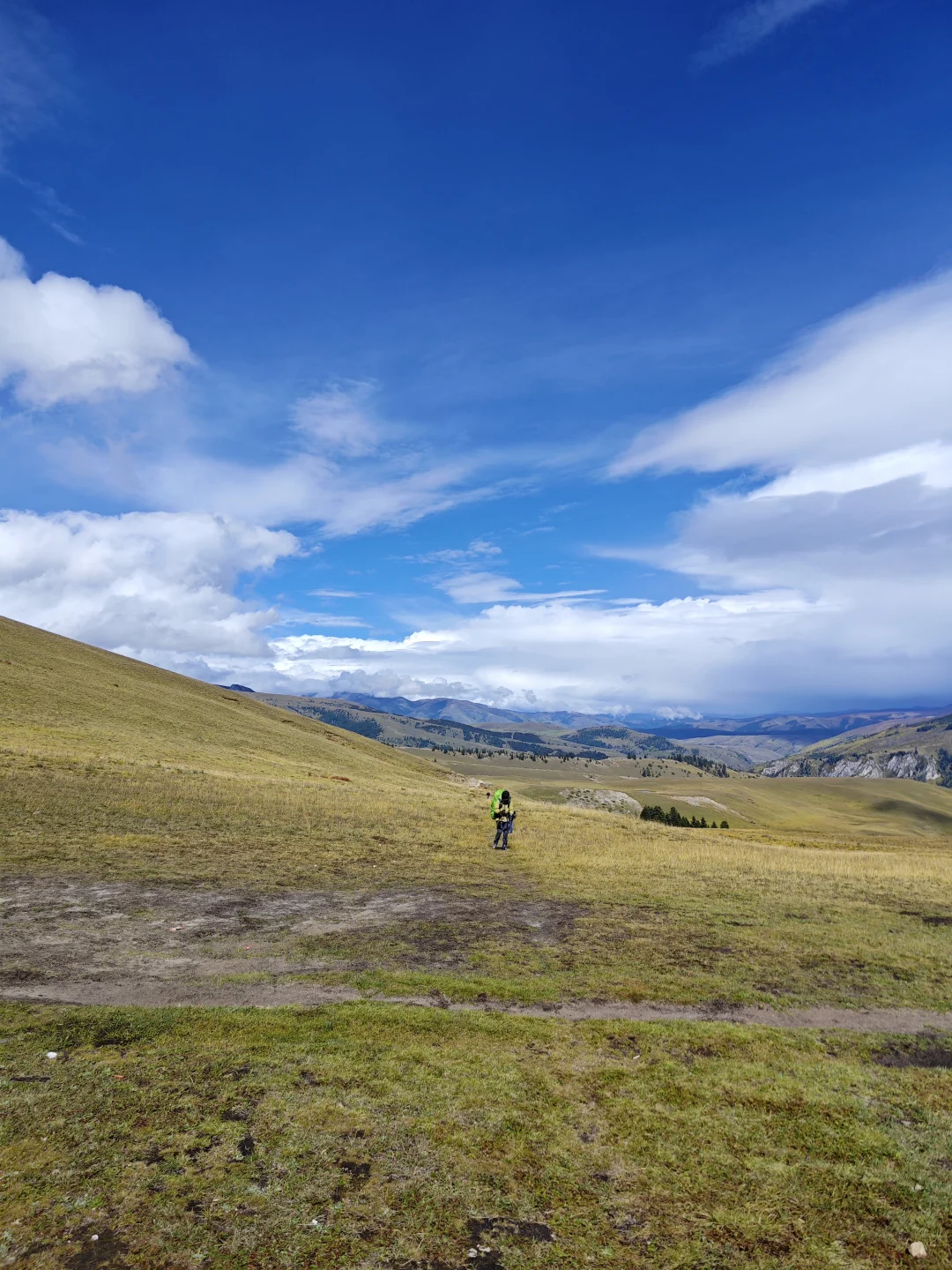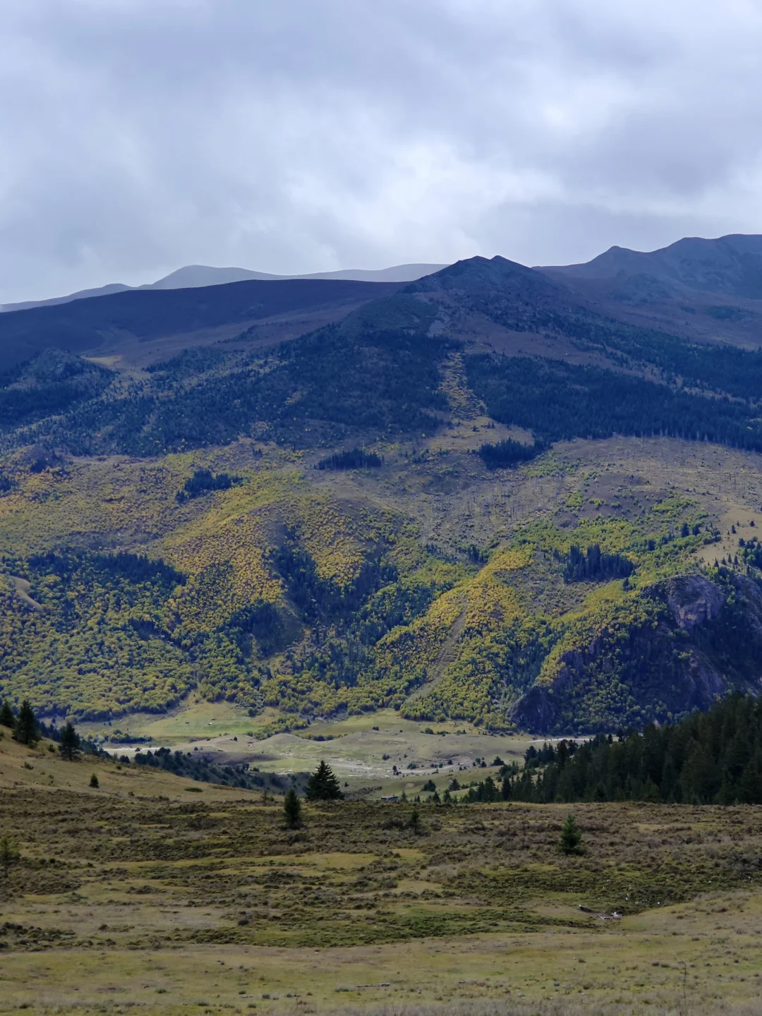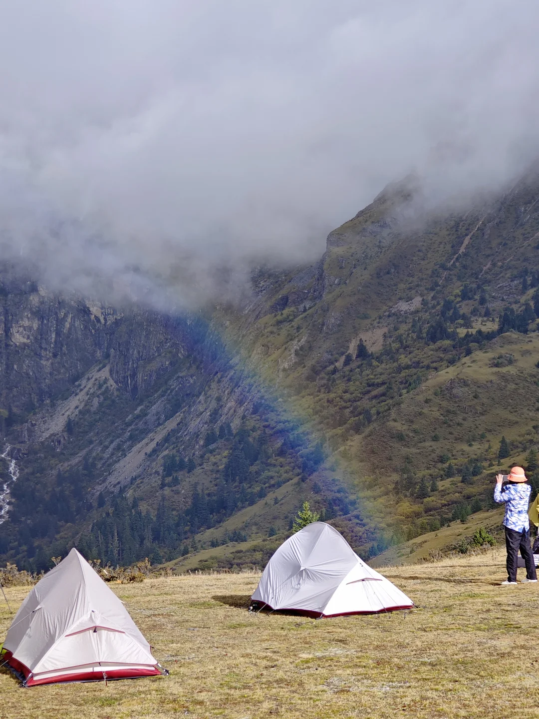 10月1日,这是格聂牧场+V线徒步的第二天,国庆假期正式开始。今天的行程是从日照金山营地出发,一路下坡到新冷古寺,然后爬升一个小坡到草原,先横切再下降到则巴村,最终到夯达营地扎营,全程约18公里,爬升约350米,下降约830米,耗时8小时34分钟。