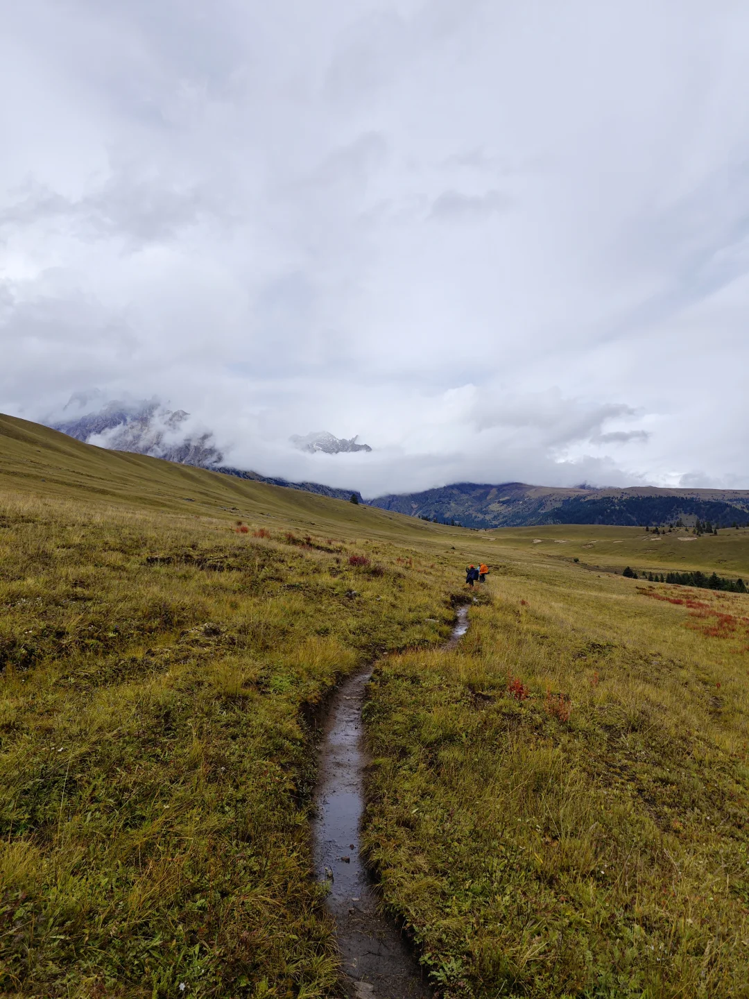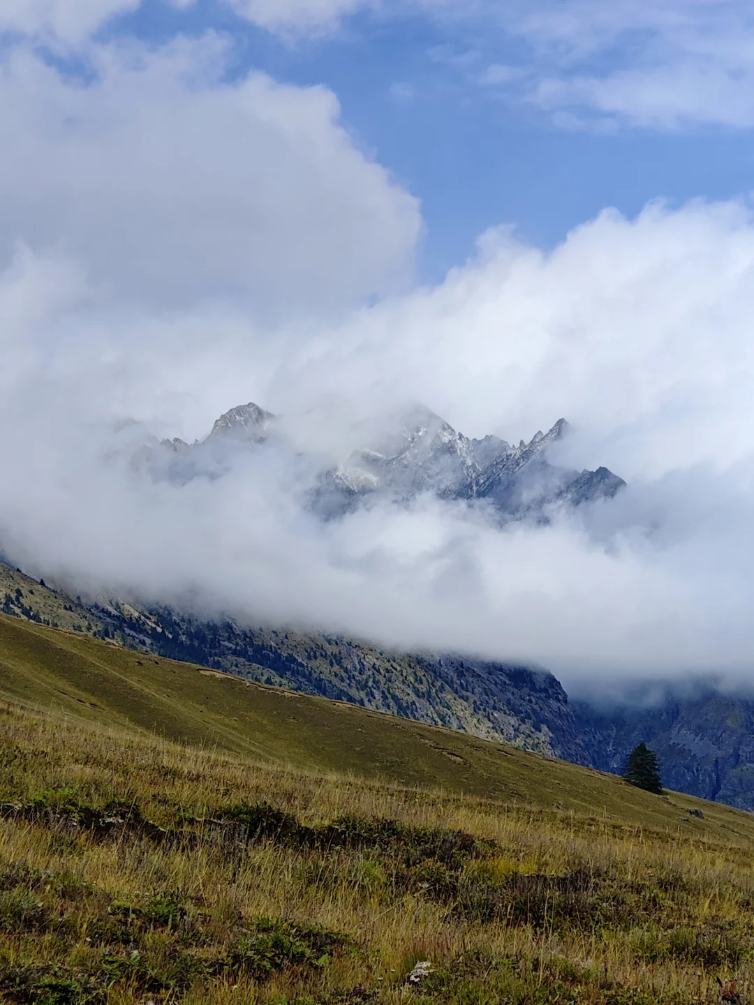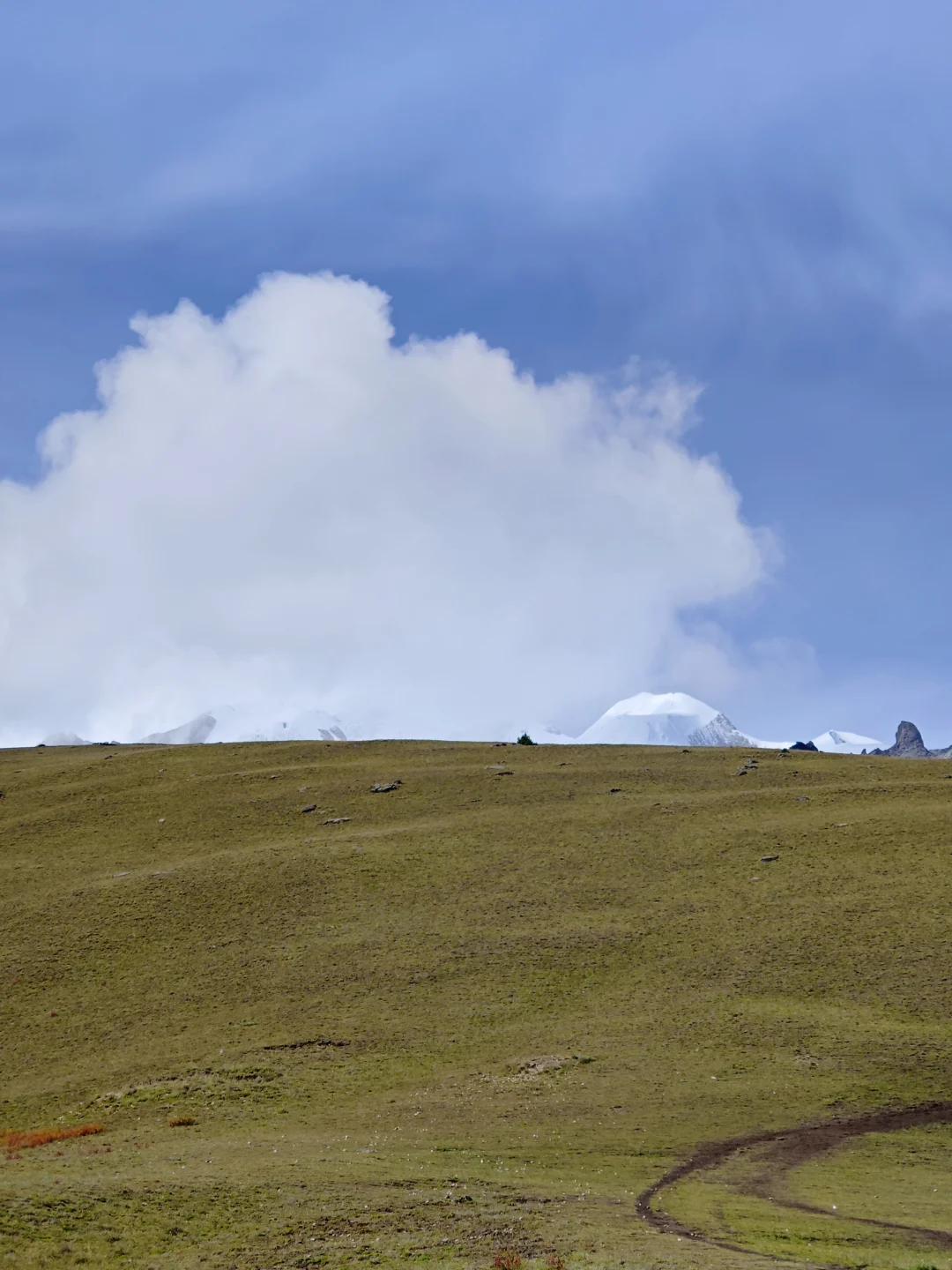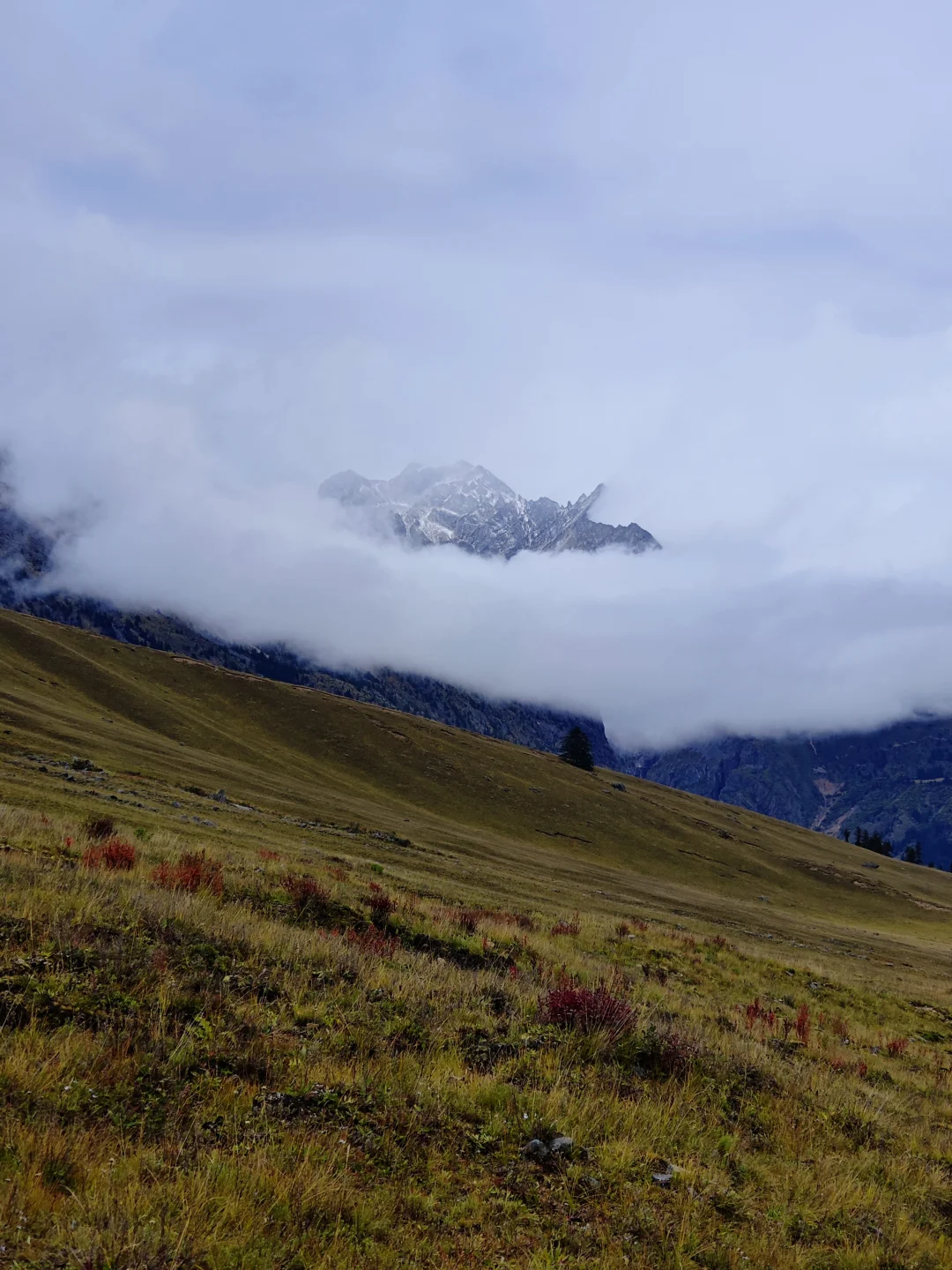 吃过午餐,雨势渐停,12点55分出新冷古寺继续前行,出新冷古寺后是一个大坡,爬升约100多米,这是今天行程中最大的爬升,之后下个小坡上个小坡到达石头房子进入草原后地势趋于平缓;下午13点45分,爬升途中开始下雨,且广袤的草原风很大,我们开始穿雨衣前行,14点57分,雨过天晴,格聂雪山揭开了云雾缭绕的面纱,露出了真容,只可惜被山脊遮挡看不到全貌,我们原本想爬上山脊去看看,但后面的云雾又将格聂遮起来了,只好作罢。