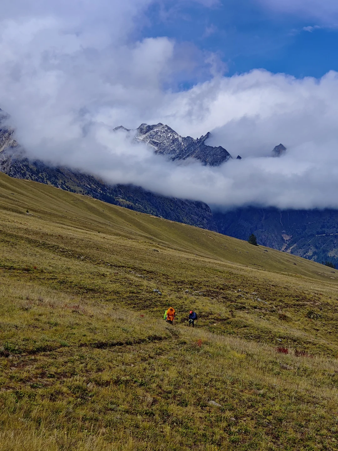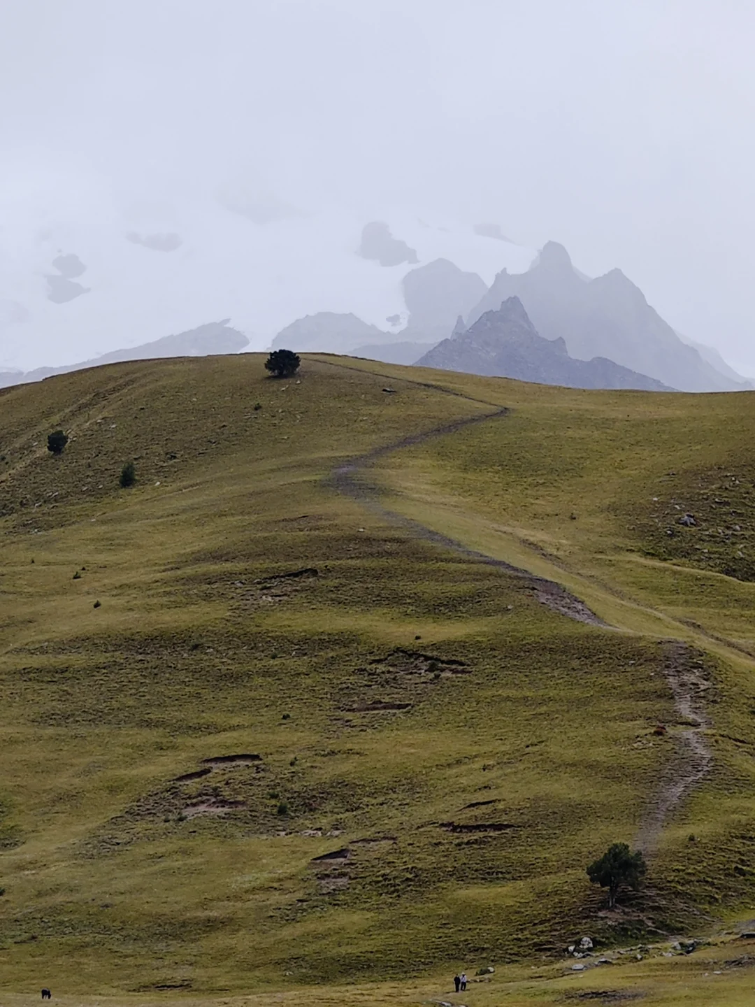 15点50分到达一棵树,开始下山,从这里下山有两条路,一条从山脊线下山,一条从山谷下山,山谷路线是传统路线,我们走的是山谷路线,山谷线有成群结队的乌鸦,不知道山谷是不是有他们的老巢;16点37分,即将到达则巴村,此时天公不作美又开始下雨,16点55分,我们到达则巴村公路,在路边摊位帐篷躲雨,同行的小伙伴也在这里吃东西。