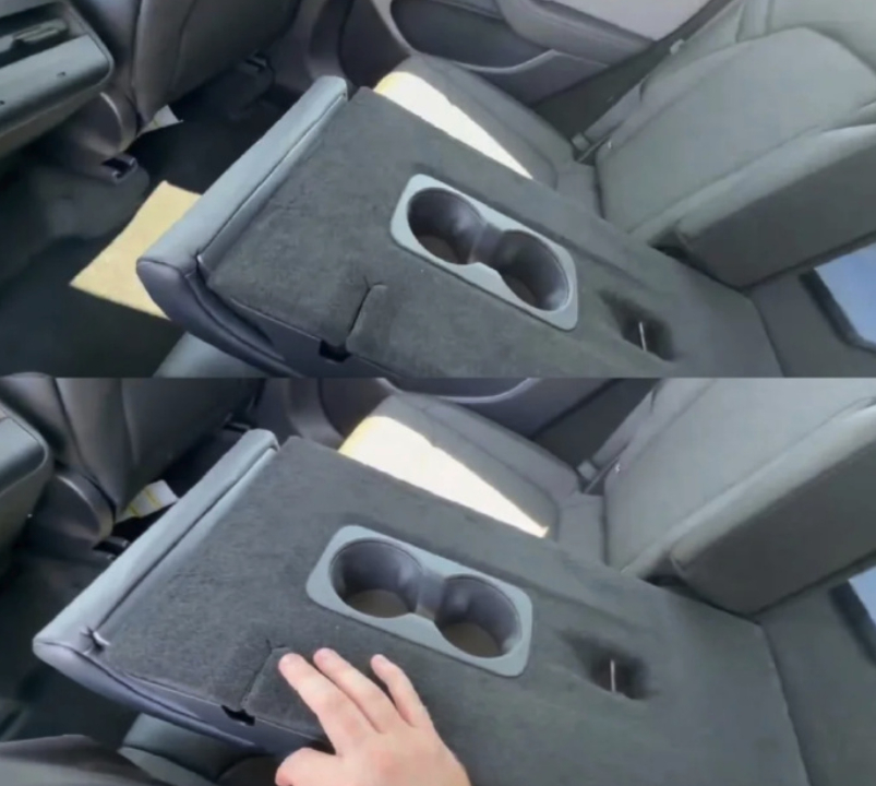 Model Y 廉价版在后排中间靠背的后面设计两个杯架,有用,但似乎作用不大。