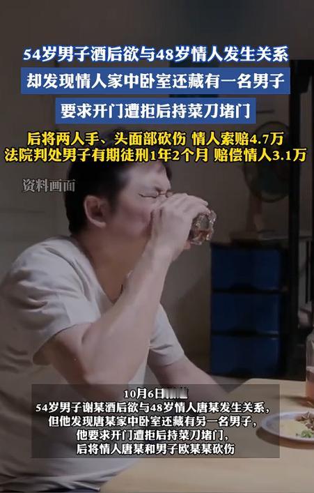“不讲武德!”湖南资兴,54岁男子晚上喝完酒想与情人发生关系,电话中听到情人那边有其他男子的声音后,遂决定前往情人家中看看,结果在情人家中果真发现一名男子。因对方躲在情人卧室里拒不出来,情人又不愿意打开卧室的门,男子一气之下持刀堵起了门,随后又先后将情人及对方砍伤,结果悲剧了! 这事儿得从 2024 年 2 月 26 号那天说起,54 岁的谢某喝得有点晕乎乎的,揣着心思往情人唐某家赶,本来想跟对方发生关系,可敲了半天门没动静,屋里隐约传出来的声响,让他心里犯了嘀咕。 追问半天唐某才松口,说卧室里还藏着个叫欧某某的男人,被堵在门外的谢某一下子就炸了,不知道从哪儿翻出把菜刀对着门板砍,还隔着门跟屋里人吵得面红耳赤。 就这么耗到第二天凌晨,唐某实在扛不住了,偷偷给堂哥发消息,让他来帮忙开门。结果门刚开一条小缝,谢某的菜刀就劈了进去,唐某的右手、头脸一下子就见了血,疼得直接倒在地上打滚。 躲在卧室的欧某某听见惨叫声,赶紧开门想上前帮忙,可也没躲过,还是被谢某砍了好几下,还好唐某的堂哥和堂嫂反应够快,俩人一起把跟疯了一样的谢某按在地上,当场就报了警。 到医院一检查,唐某伤得真不轻:右手拇指骨头断了、肌腱也伤了,连颅骨都被砍出了口子,光住院就住了 14 天,欧某某伤得怎么样没细说,但光听这动静,就知道肯定不好受。 有人说谢某是 “被背叛急昏了头”,可法律哪会惯着冲动?法院最后判了谢某故意伤害罪,蹲一年两个月大牢。 后来唐某又起诉要赔偿,张口要 4 万 7 千元,法院判谢某赔 3 万 1 千元,自由没了,钱也没了,谢某这把怒火,让他赔了夫人又折兵。 可没几个人算得清,这场见血的闹剧,到底毁了多少东西。 谢某和唐某是情人,唐某又跟欧某某不清不楚,这三人本来就是见不得光的三角关系,结果被谢某这把菜刀,直接劈到了三个原本安稳的家庭上。 说到底,谢某砍出去的哪里是刀?是把三个人心里的贪婪、自私,全变成了砸向三个家的石头。 他以为发脾气能解气,却没算明白:婚外情本就是给家里挖的坑,冲动就是把人往坑里推的手。 到最后谁都没赢,就剩三个碎了的家:谢某家没了顶梁柱,老婆得顶着 “丈夫是罪犯” 的名声过日子,孩子在学校都抬不起头。 唐某家没了信任感,断了的手指握不住家的温度,裂了的颅骨也装不下曾经的安稳。 欧某某家最冤,平白添了道洗不掉的疤,老婆孩子跟着担惊受怕。 感情里的错,哪能靠刀子解决?家里的安稳,也经不住半点私情和冲动的折腾。 别等刀砍下去、家碎了才后悔,一时的糊涂、一阵的火气,毁的可能是好几家人一辈子的安稳。 对此,你有什么看法呢?