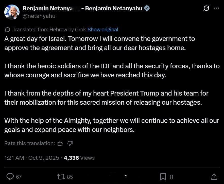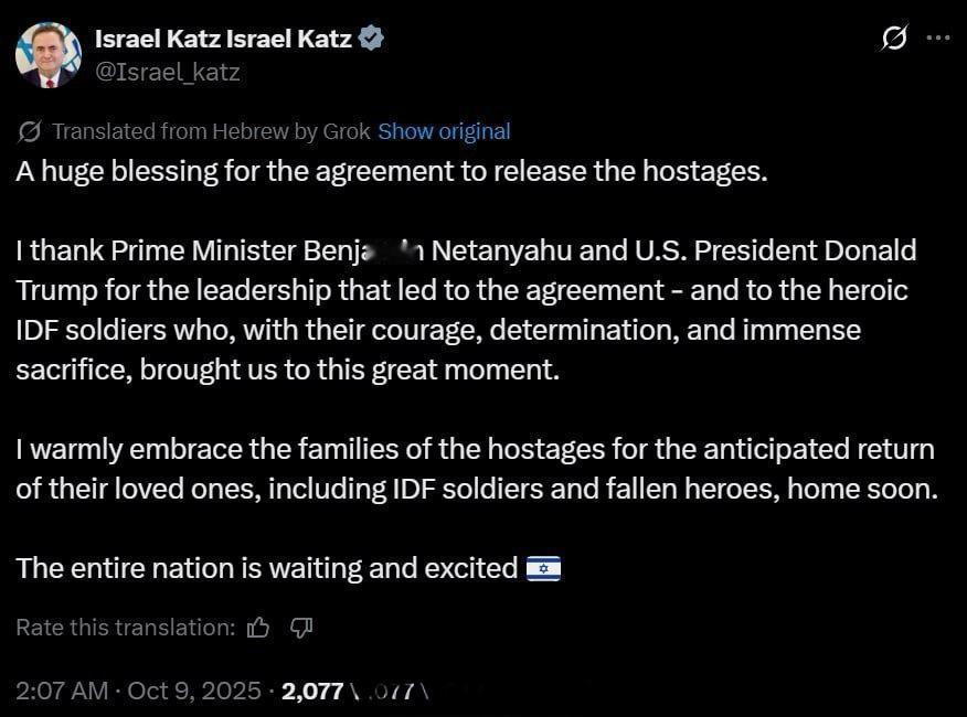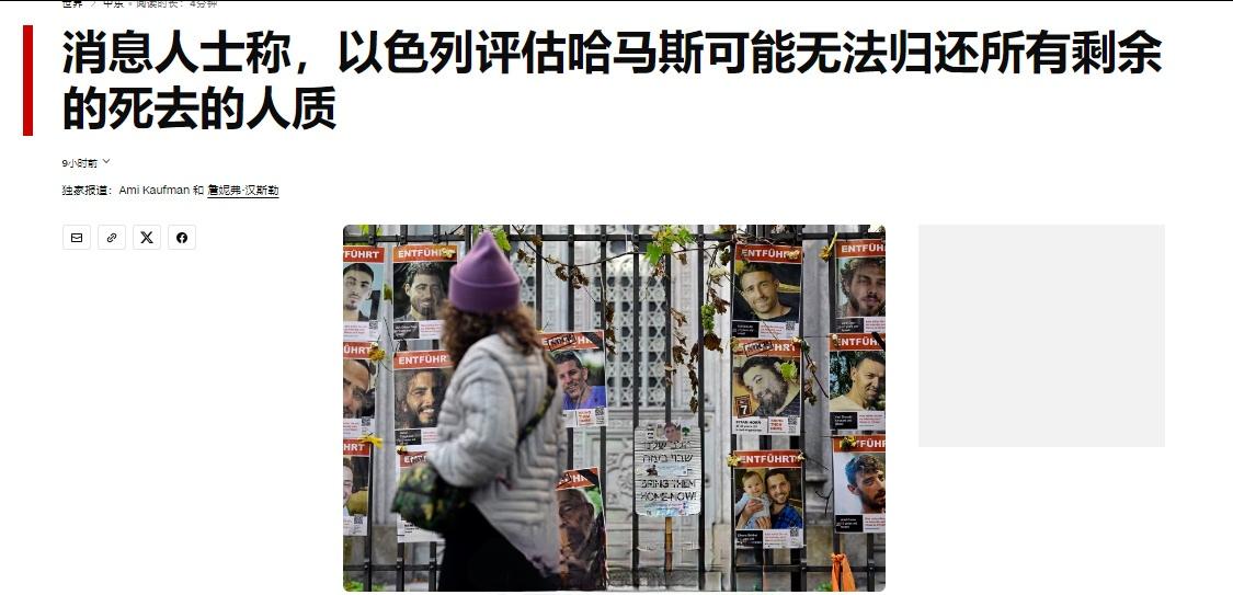 以色列媒体抱怨说,两年前以色列还是国际社会同情和拥抱的对象,而两年后的今天以色列已经被国际社会普遍拿来和纳粹德国相比较,这是前所未有的事情。 当地时间今天白天,以色列空军对巴勒斯坦加沙市发动多次袭击。 以色列安全部门表示拦截了伊朗向巴勒斯坦约旦河西岸地区运输的一批武器弹药,包括多架无人机、反坦克火箭筒、手榴弹、步枪、机枪、子弹等。不过,辛贝特表示有一部分武器弹药已经进入西岸地区,目前他们无法追踪其流向。 以色列军方声称,巴勒斯坦抵抗运动最近通过地道对加沙地区中部尼扎里姆走廊上的以色列第1“戈拉尼”步兵旅的据点发起了主动进攻,可能试图俘虏以军士兵,可惜未能成功。 目前以色列媒体普遍认为,无论加沙战争是否能够就此结束,以色列政权发动的下一场战争已经进入倒计时。 昨天,以色列非法定居者对巴勒斯坦约旦河西岸地区的代尔贾里尔村以及附近区域发动了武装袭击,枪杀了一名巴勒斯坦人吉哈德·阿贾吉(获释囚犯),打伤多人。 卫星图像显示,以色列内瓦蒂姆空军基地附近的固体燃料弹药生产厂正在进行大规模扩建。 CNN报道称,以色列官员评估认为,即使达成相关交换协议,巴勒斯坦抵抗运动已经不可能找到全部的被以色列军队杀害的以色列战俘的尸体。此前巴勒斯坦信源曾透露,一部分以色列战俘的尸体已经在以军的反复轰炸中不复存在了。 极端正统派犹太人昨晚在卡法尔约纳监狱前举行示威,这里被用于安置应征入伍士兵和被捕的逃兵。不过这次他们仅仅是闹事,没能救出任何一个壮丁。 内塔尼亚胡在昨天的采访中呼吁大家多阅读犹太教经书《塔木德》(类似于绿的《圣训》,是犹太教的生活指导和戒律手册),声称这里面有很多逻辑,有利于培养创新思维。 以色列频道报告称,昨晚有两名以军士兵在加沙地区北部被IED炸伤。 以色列国防部长卡茨就加沙停火协议发表评论:“达成释放人质协议是一个巨大的福音。我感谢本杰明·内塔尼亚胡总理和美国总统唐纳德·特朗普的领导,促成了这项协议——以及那些凭借勇气、决心和巨大牺牲精神,将我们带到这一伟大时刻的英勇以色列国防军士兵们。 我衷心拥抱人质家属,期待他们所爱的人,包括以色列国防军士兵和牺牲的英雄们,能够很快回家。 整个国家都在等待并感到兴奋。” 目前以色列的多名右翼和极右翼政要(财政部长斯莫特里奇,司法部长莱文)以及几个右翼媒体基本上都不满意新的加沙停火协议,不过我感觉主要原因还是当初内塔尼亚胡给他们承诺的战争目标太高了,他们现在有极大的落差感。 据报道,以色列国防军已发布新命令,要求其部队撤退至所谓的“黄线”,这是美国总统特朗普斡旋停火谈判中达成的划界线。 地图显示了以色列军队的撤退区域,并标注了“黄线”距离加沙边界的距离。这将标志着自近两年前巴以冲突开始以来,以色列军队的首次大规模撤退。 以色列总理内塔尼亚胡:“对以色列来说,这是一个重要的日子。我将召集政府批准协议,将所有被扣押人员接回国。 我感谢以色列国防军的英勇士兵和所有安全部队,正是他们的勇气和牺牲让我们达到了这一天。 我衷心感谢特朗普总统及其团队为释放我们的人质这一神圣使命所做的动员。在全能者的帮助下,我们将继续共同实现所有目标,并与邻国扩大和平。” 美国总统特朗普在福克斯新闻上称人质(被哈马斯扣押)可能会在下周一被释放。“人质将被释放——可能我们的时间是周一…… 就在我们说话的时候,正在发生很多事情以释放人质,我们认为他们都会在周一回来,其中还包括死者的遗体。” 数小时前拍摄的照片显示,在以色列北部阿富拉市附近耶兹雷尔谷地的一片农田上写有“诺贝尔奖授予特朗普”的标语。 卡塔尔媒体援引谈判参与者的消息,以色列当局今天已经同意在换囚中释放马尔万·巴尔古提、艾哈迈德·萨达特、易卜拉欣·哈米德和哈桑·萨拉迈,然而依然拒绝释放阿卜杜拉·巴尔古提。 以色列《新消息报》发布了今天白天以色列军队在加沙地区进行撤退的一些照片。 加沙停火前一小时,以色列军队在巴勒斯坦抵抗运动的一次主动进攻中遭受了伤亡。 今天有一批以色列扶持的加沙二鬼子部队成员被逮捕,并被当场打断了手臂。