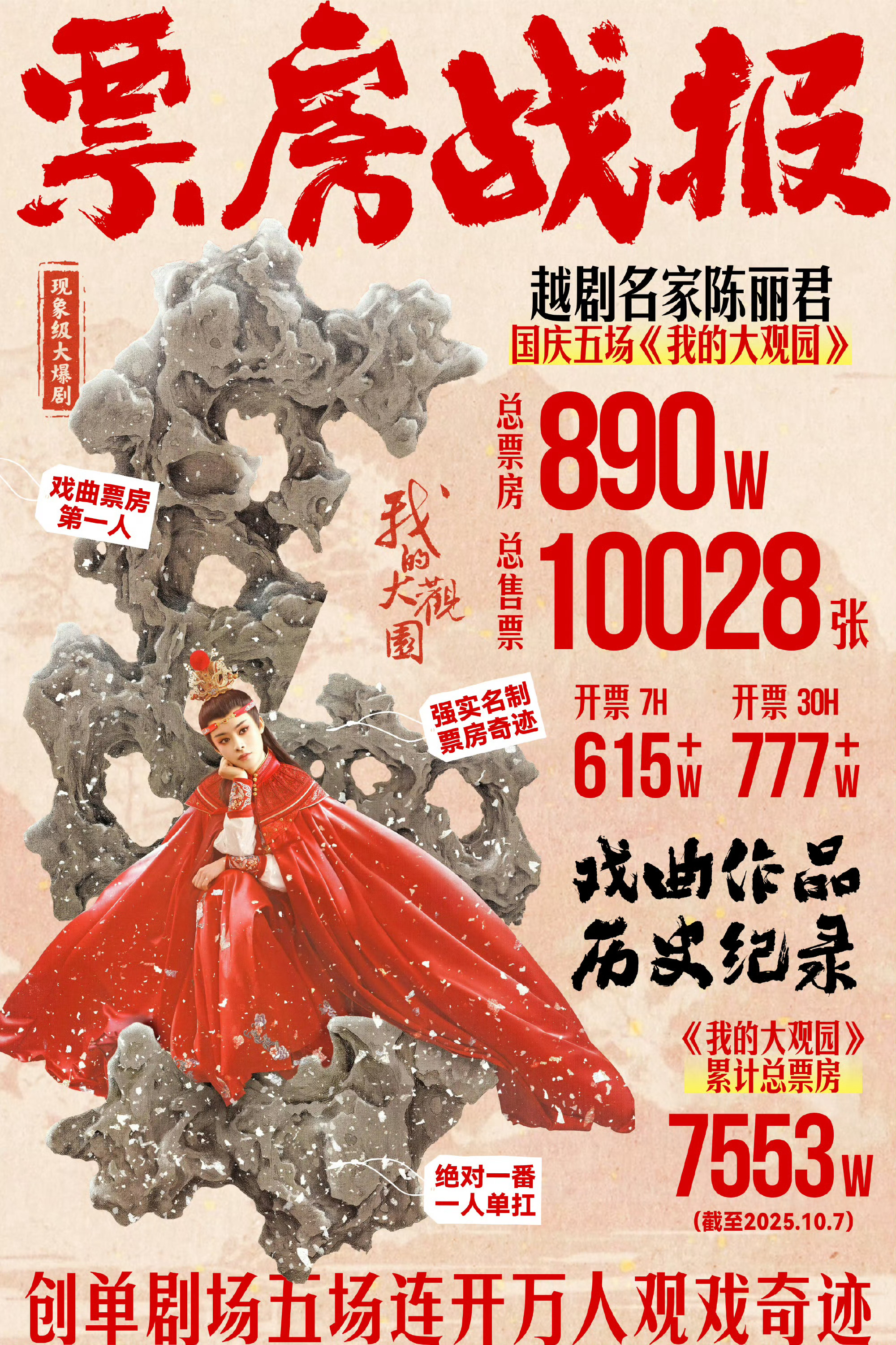 陈丽君我的大观园国庆五场演出票房达890万元,售票10028张,场均观众破200