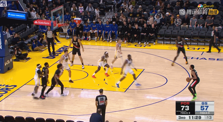 不过这次狂丢篮板的防守中,还是值得截图看看这两个事。图1,库明加的close out,日常被晃飞,但迅速回追,临了还干扰了卡马拉出手。图2,最终是库明加“终结”了开拓者第五次出手。解说:Kuminga says that's enough.