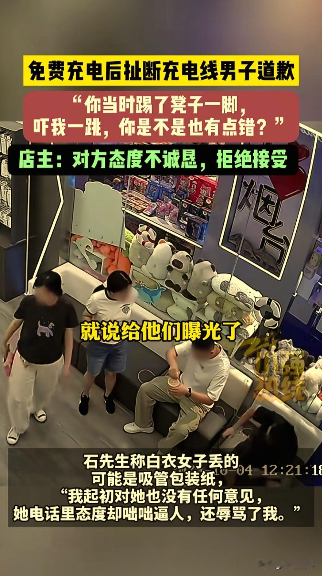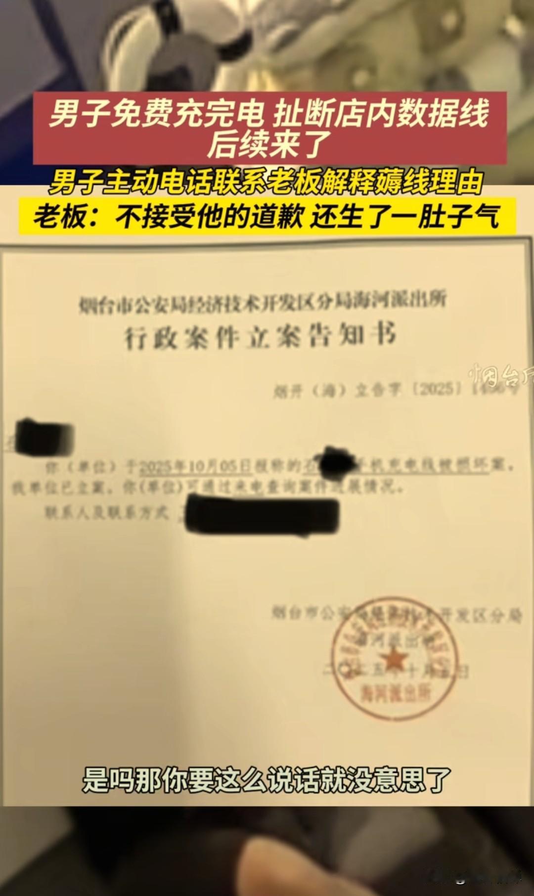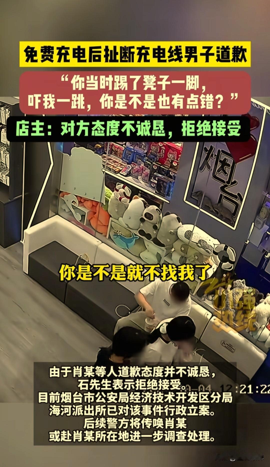 男子在烟台开发区万达手机店免费充电后扯断充电线事件,目前有了新的进展,涉事男子打