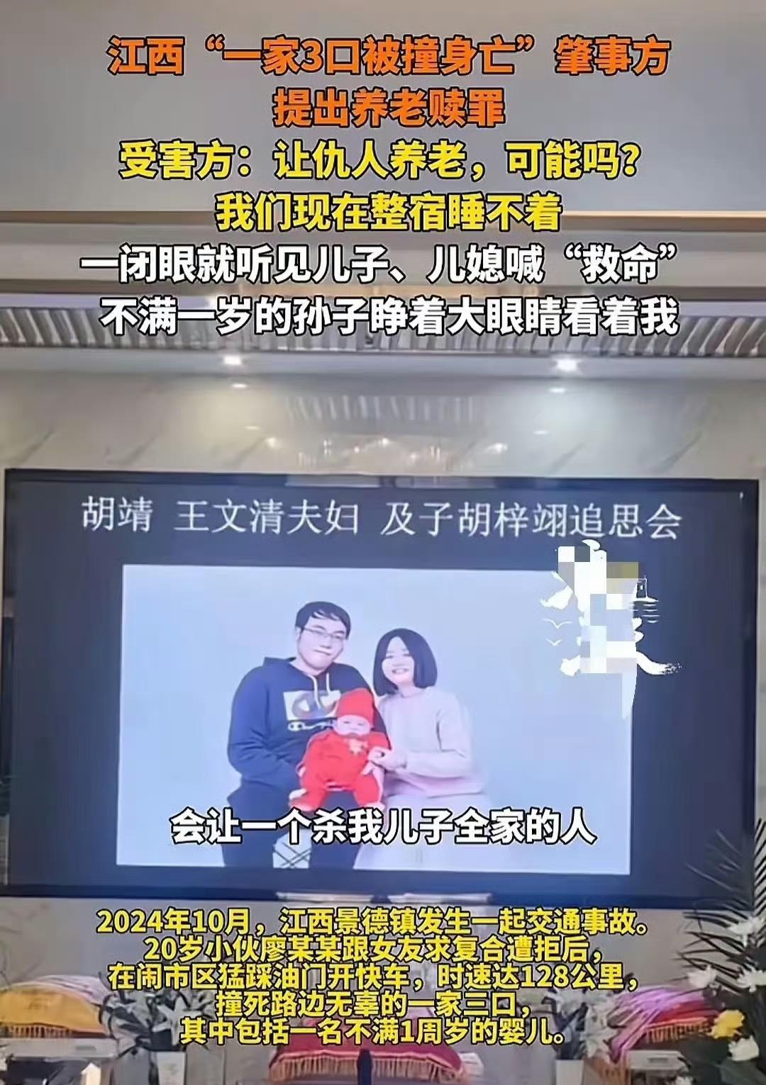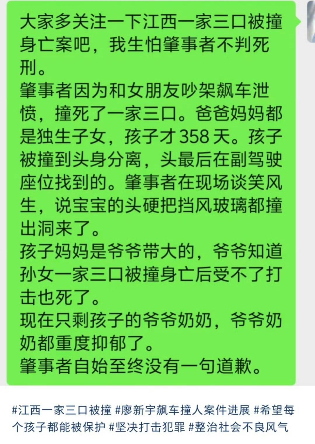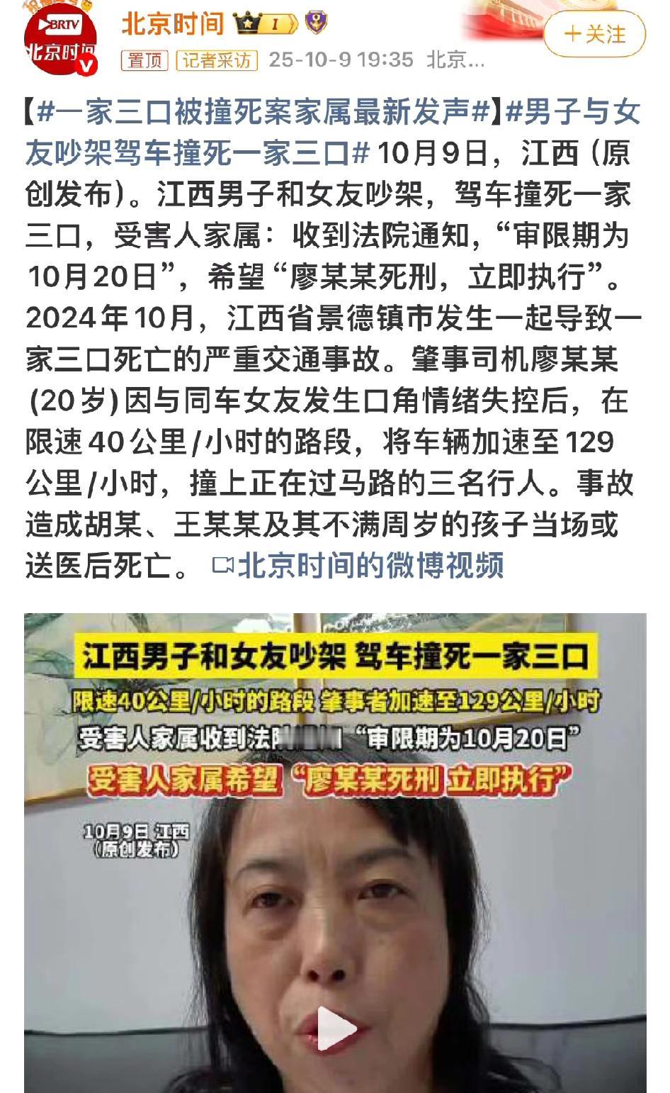 家属:要他死刑立即执行 江西景德镇,一个20岁的小伙廖某某,和女友吵架吵上头了。在限速40公里的路上,他把车飙到129公里,直接撞上过马路的一家三口。结果,胡某、王某某和他们不满周岁的孩子,当场或送医后都没了。 10月9日,受害人家属说,收到法院通知,案子审限期是10月20日。家属就一个要求:判廖某某死刑,立即执行。 你想啊,就因为和女友吵个架,这么点小事情,情绪一失控,就害了三条人命,其中还有个没满周岁的孩子。这一家子招谁惹谁了?就他这个状况,这次不严惩,下次必定会再出事。 现在家属就盼着法院能从重从快判决,给死去的亲人一个交代。咱们也等着看,这事儿最后是否能有个公正的结果。江西撞死三人案 景德镇被撞案 景德镇惨剧 江西杀两人 景德镇家庭惨剧 景德镇肇事者 景德镇肇事父子 景德镇撞人案 信息来源:北京时间