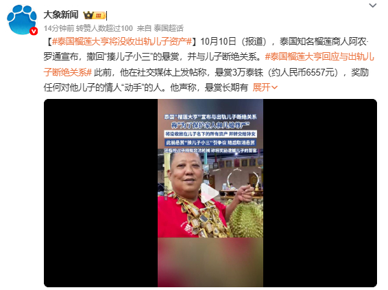 泰国榴莲大亨将没收出轨儿子资产泰国春蓬府知名榴莲商人阿农・罗通,因儿子婚外情掀起家族风波。他先悬赏 3 万泰铢 / 巴掌求打儿子情妇,后再悬赏 5 万泰铢奖励抓涉非法持枪的儿子,