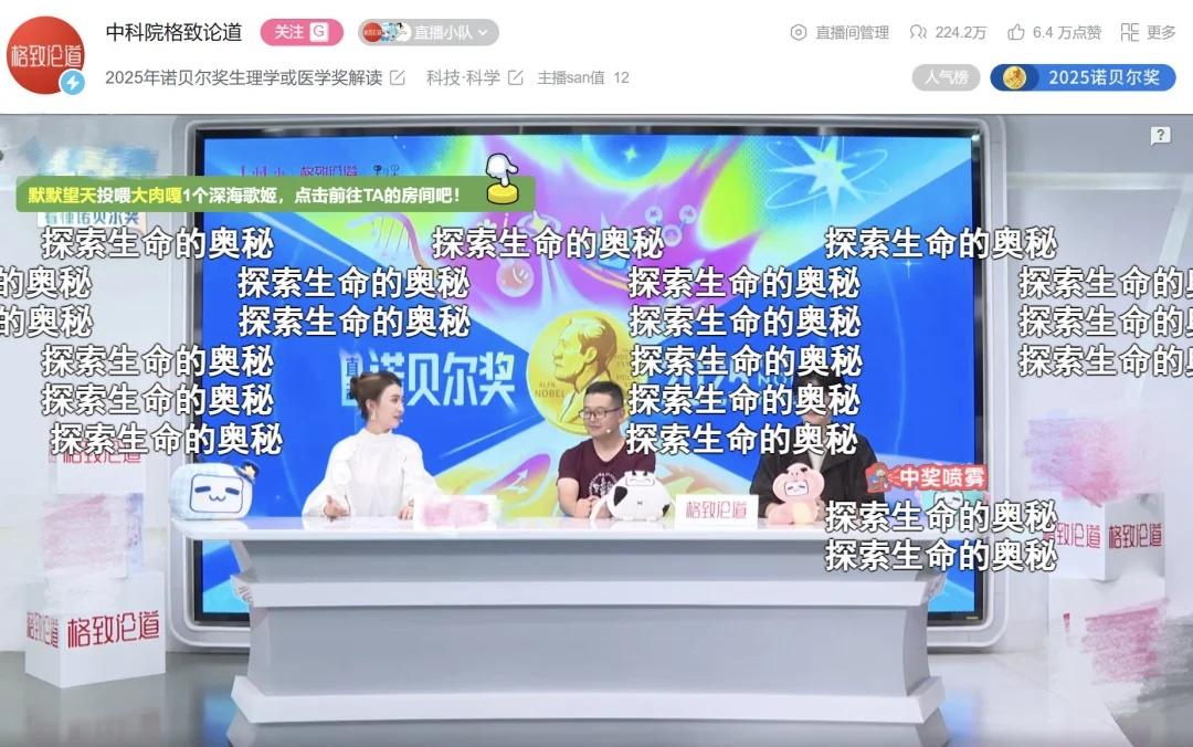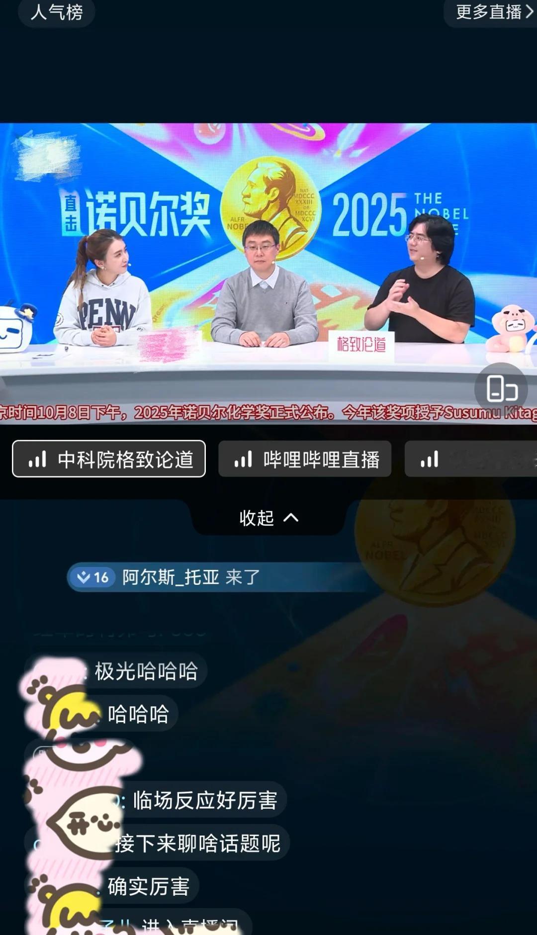科学节目主持人的国庆|诺贝尔奖直播收官 这个十一好充实,见证了诺贝尔奖开奖的紧张激动。迅速学习了外周免疫耐受、宏观量子隧穿、金属有机框架这些科学知识[害羞] 是的,每天开奖完2h后就要直播,2h的时间,完成化妆、吃饭,同时,从零开始准备知识点,理顺直播内容。导演组确认连线专家,完成现场开奖画面的中文字幕翻译,她们真的太强大了[赞] 经历了现场嘉宾及连线嘉宾一直变动,临直播才出现在演播间;经历了瑞典连线失败,临时现场继续talking;经历了连麦嘉宾非常学术,我一句听不懂,只好临时cue现场嘉宾解读;经历了直播开始时开奖画面字幕还没加完,一边播一边随时调整流程。 但很开心[大笑]短时间学习了好多前沿科学知识,还都是和国内最一线的科学家学习。还有直播间内每位朋友的善意和肯定,让直播的我们聊的也格外开心感谢@格致论道 让我遇见“诺贝尔”。我怕是需要时间来戒断了… 诺贝尔奖 科学 科普 主持人