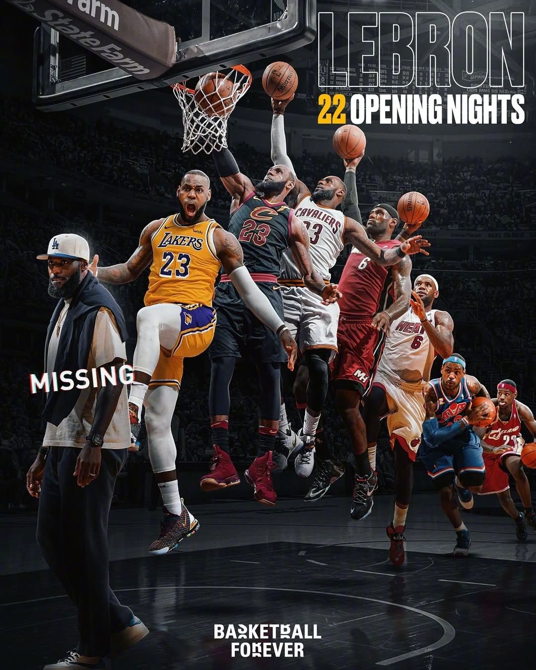 勒布朗职业生涯中参加过 22 场揭幕战,本赛季是他第一次缺席揭幕战
