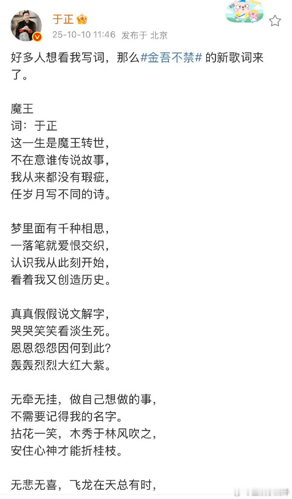 于正写的《魔王》歌词太绝了!把“魔王”的复杂层次写得淋漓尽致,文字自带画面感,和金吾不禁的演绎适配度满分。