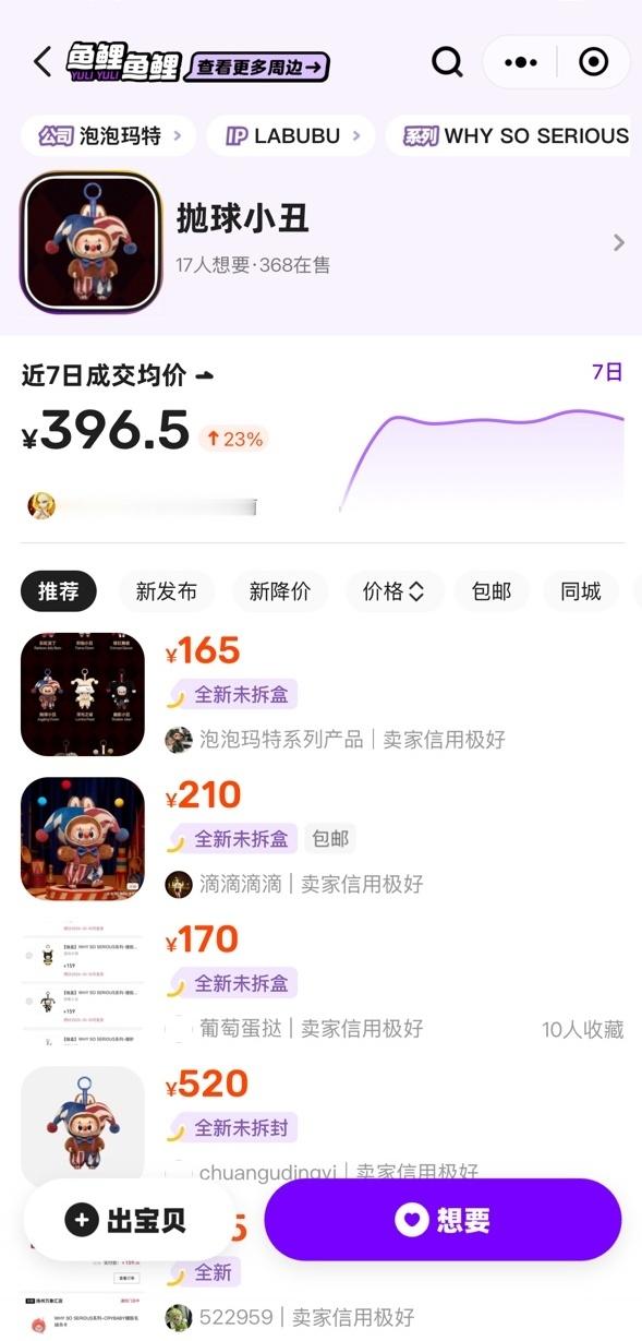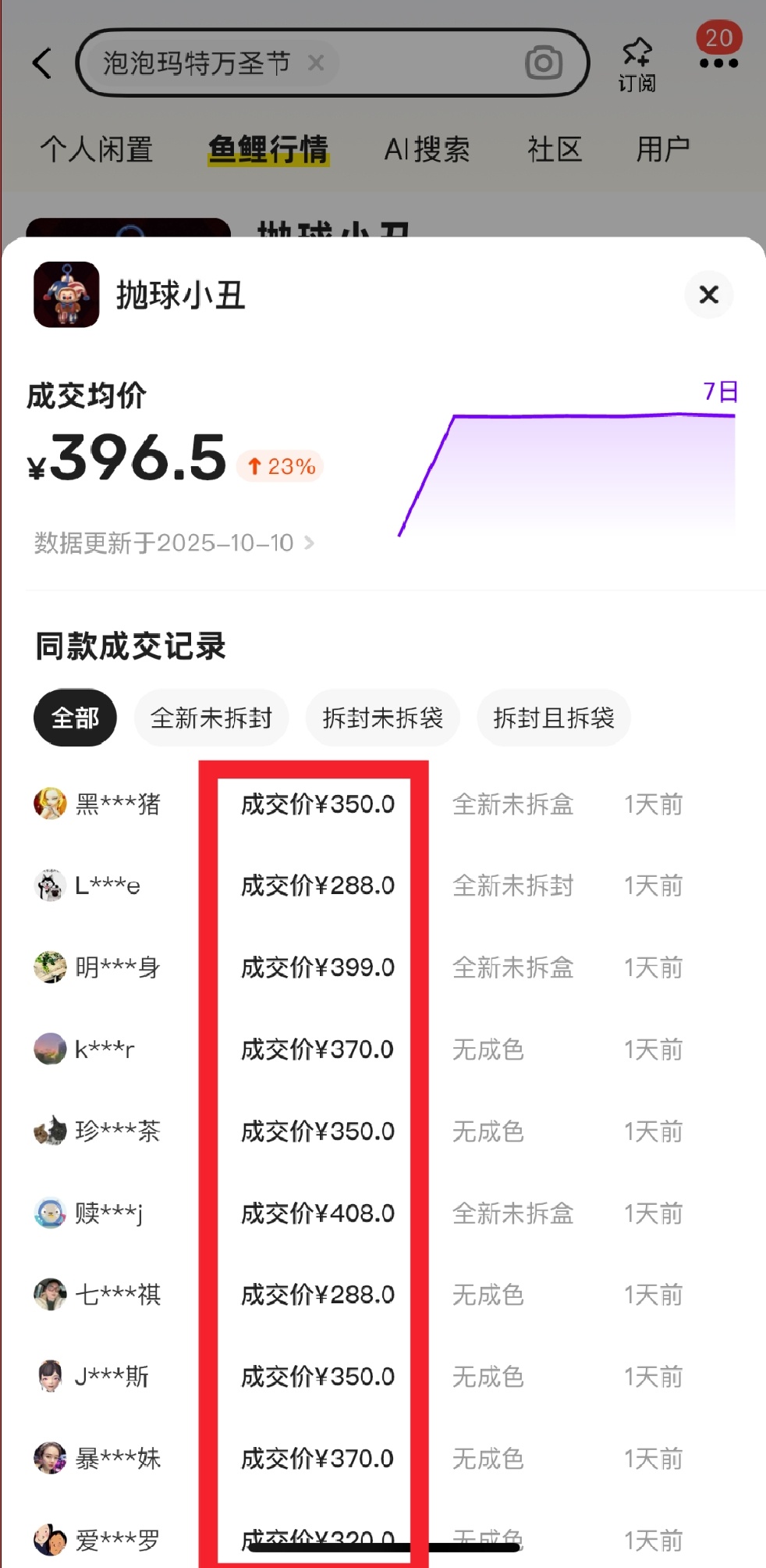 抢泡泡玛特市场风吹草动,闲鱼行情先动!严重怀疑被泡泡玛特KTV了,在闲鱼搜索“泡泡玛特万圣节”,点击鱼鲤行情tab,即可看到抛球小丑的行情,热度一直在升,感觉价格还会再往上升,所以我现在觉得便宜可以入......bushi,我这心态正常吗?