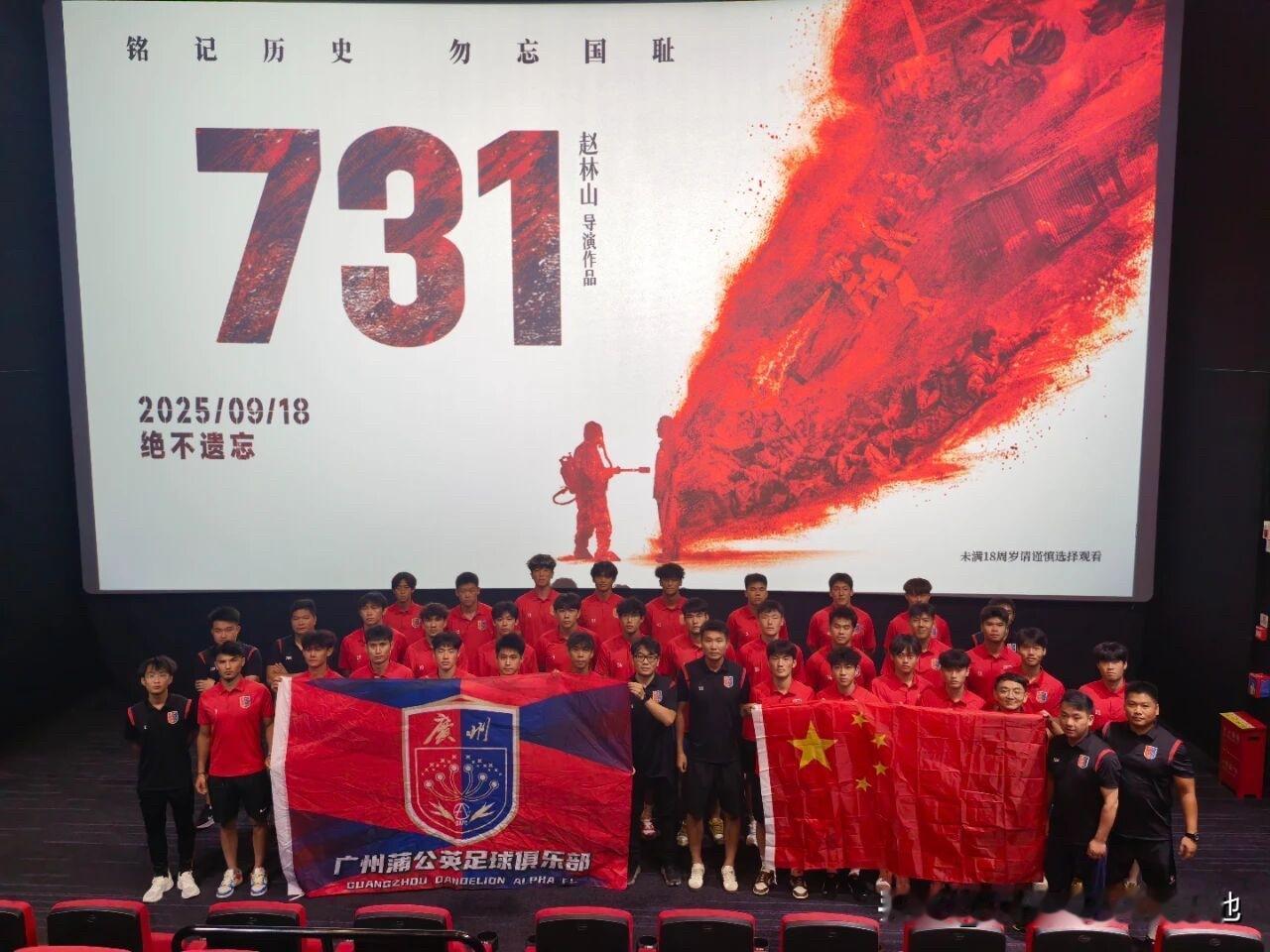 很好,不仅要看《731》,最好也组织看《沉默的荣耀》,年轻球员必须树立正确的爱国情怀,这样才球场上才更有拼劲,继续加油,@广州蒲公英足球俱乐部 此举很明智! ——秋日午后,光影为媒。近日,广州蒲公英足球俱乐部全体成员齐聚影院,开展了一场以“铭记历史,吾辈自强”为主题的爱国主义教育活动,共同观看了具有深刻教育意义的影片《731》。 展望未来,广州蒲公英足球俱乐部将继续把爱国主义教育作为团队建设的核心环节,通过更多元、更深入的形式,将爱国的种子根植于每一位成员心中。球员们将带着这份源自历史的精神力量,以更加昂扬的斗志和更坚实的步伐,迎接每一场挑战,回报球迷与社会各界的厚爱,展现南粤足球的独特风采。俱乐部也将坚守初心,深耕本土青少年足球发展,为中国足球的未来贡献一份坚实的“蒲公英力量”。[赞]