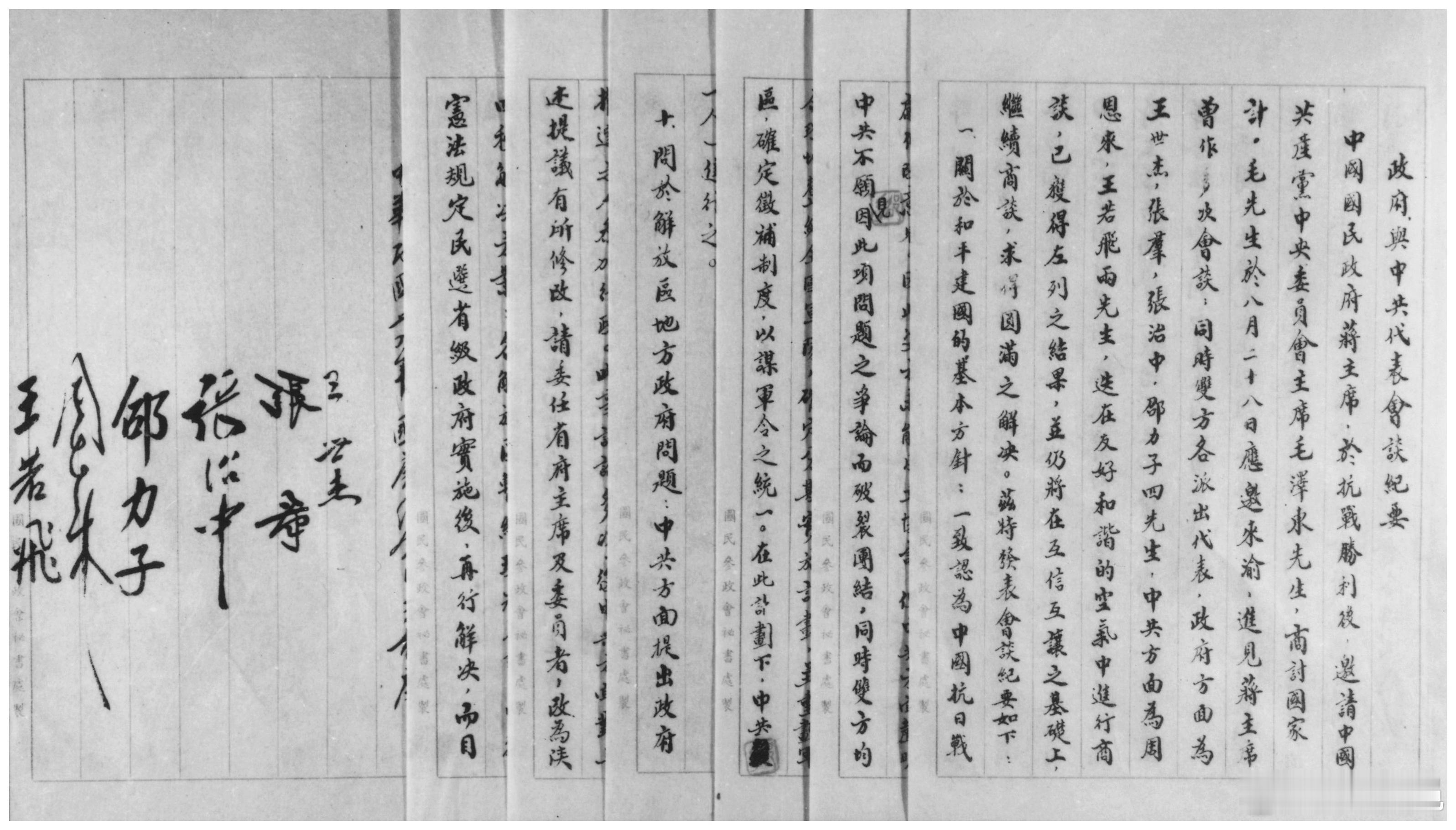 1945年10月10日,抗戰勝利僅兩個月後,中國國民政府代表王世杰等人與中國共產黨代表周恩來在重慶簽署《政府與中共代表會談紀要》,史稱「雙十協定」。