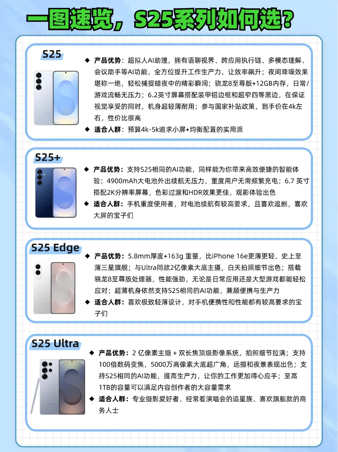 今天给大家带来呼声很高的S25系列全攻略,四款机型精准匹配不同需求,跟着选绝对不踩雷!具体参数对比图已放在封面,建议保存到相册随时对照~