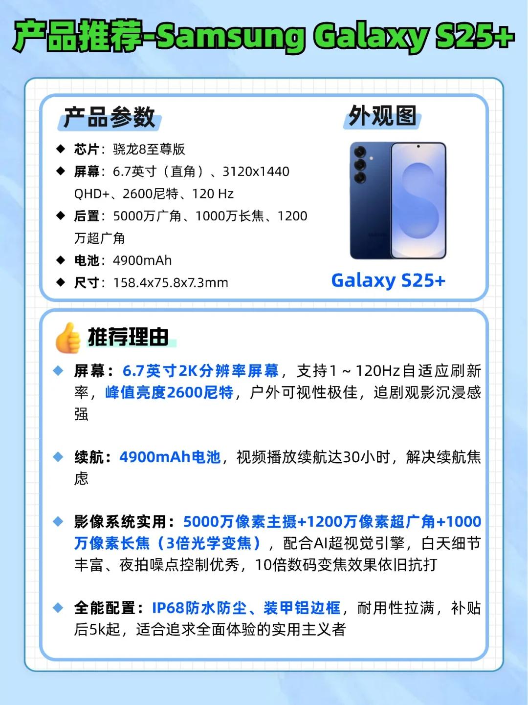 大屏长续航党→S25+(6.7英寸屏幕+4900mAh超长待机)