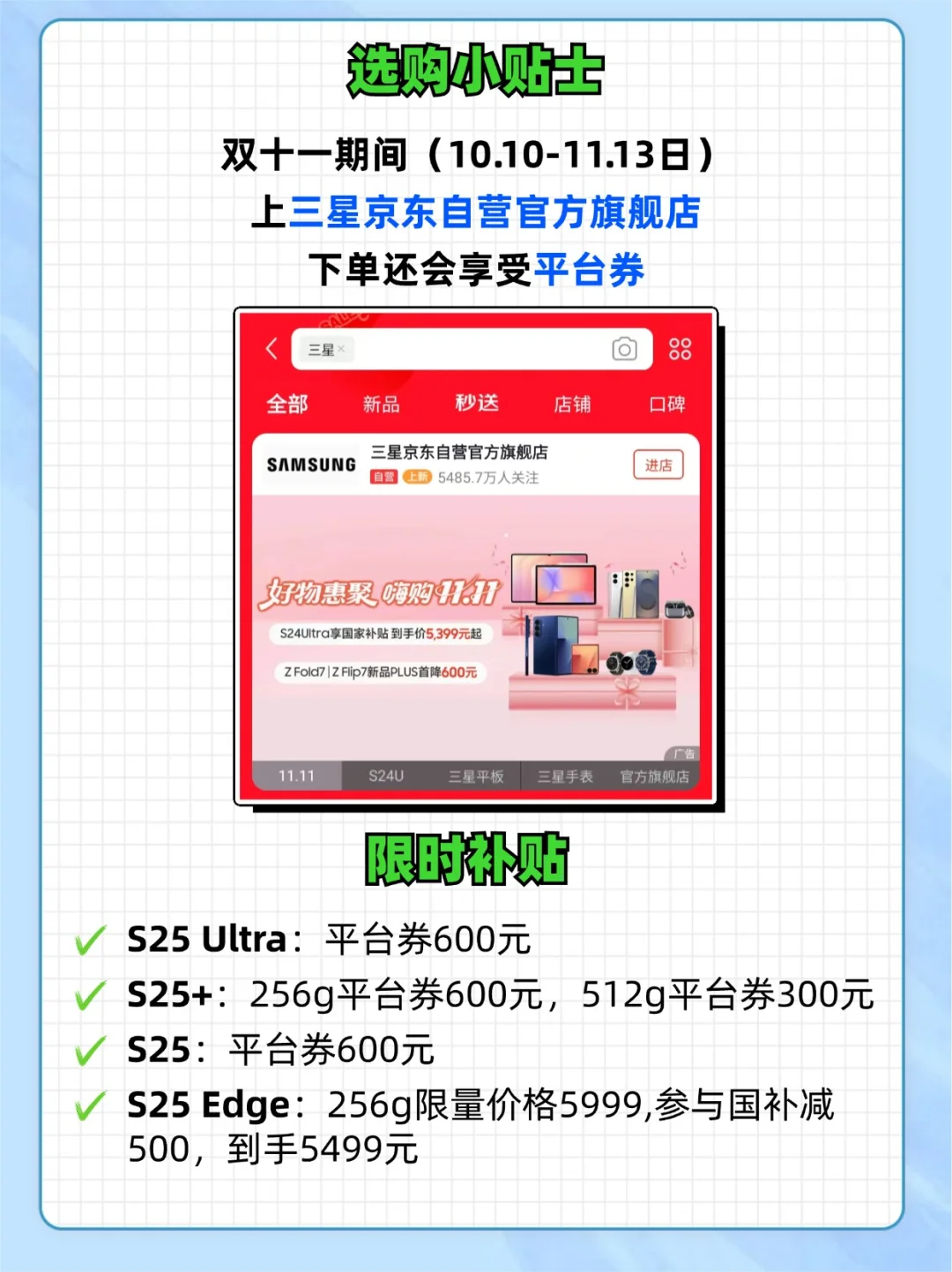 宝子们划重点!这次活动只到 11.13,过了再想要这个价真的要等明年!直接冲三星京东自营官方旗舰店,不同机型优惠都给你们整理好啦: