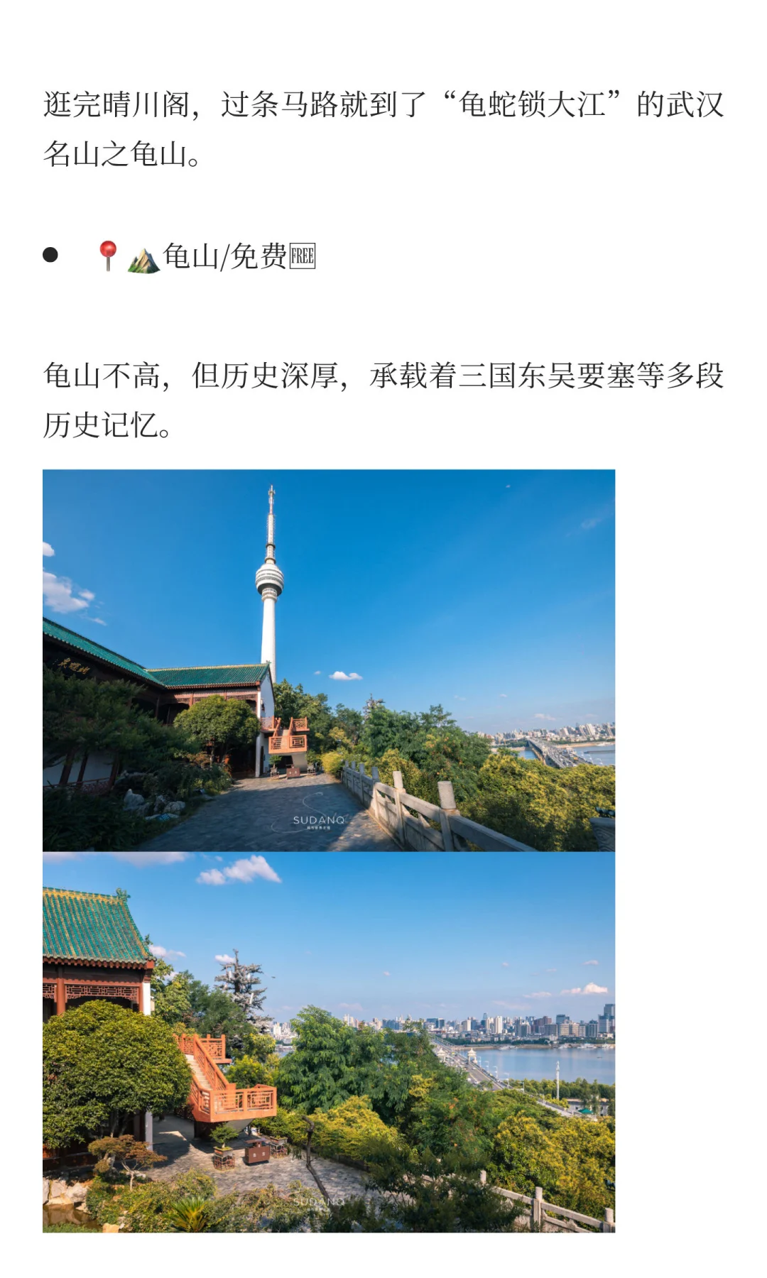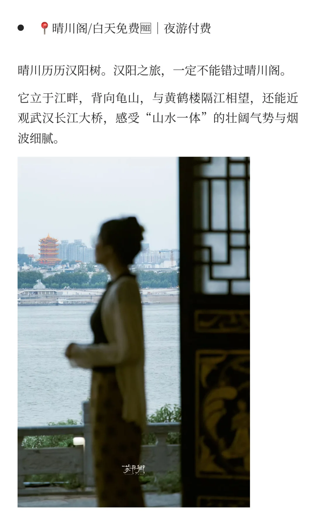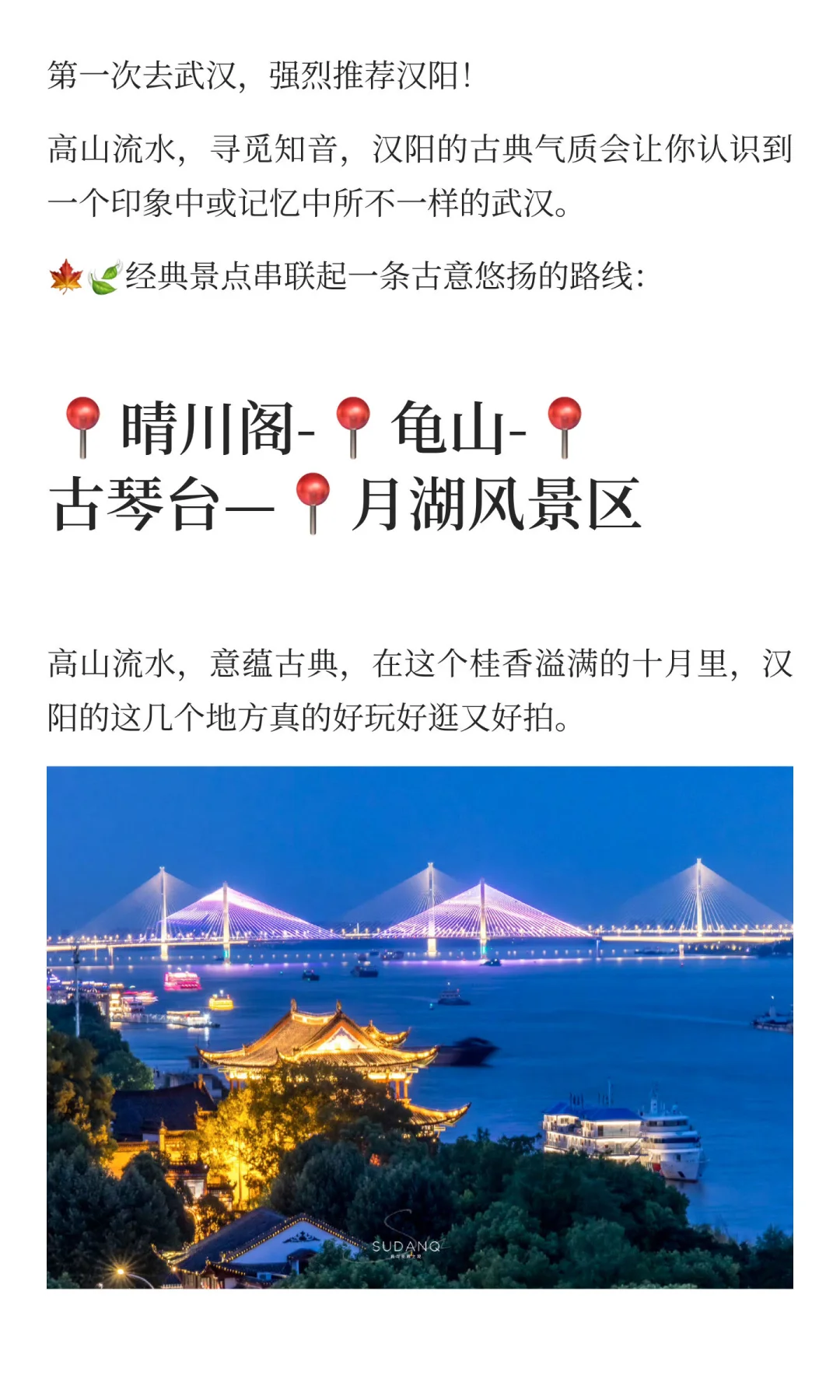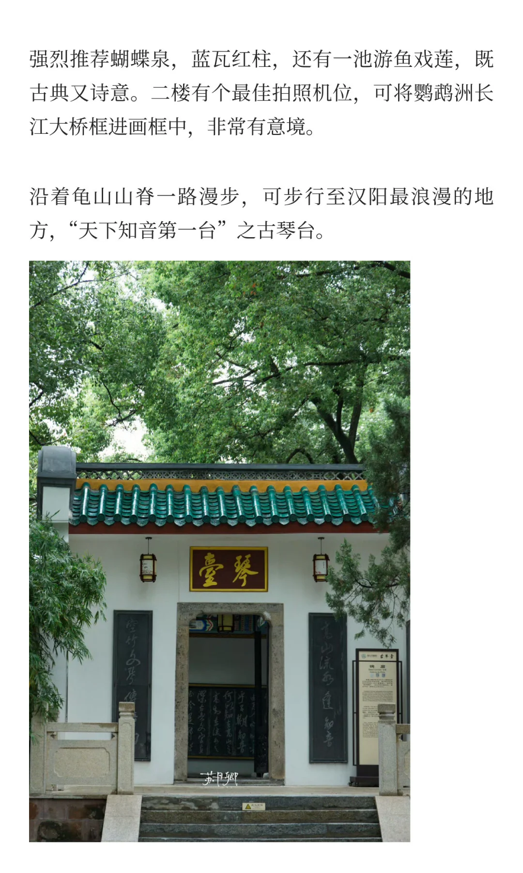 汉阳之旅推荐晴川阁、龟山、古琴台和月湖风景区。 📍晴川阁江畔,📍龟山历史深厚,📍古琴台古典诗意,📍月湖幽静秀气,各具特色,适合拍照和感受古典氛围。