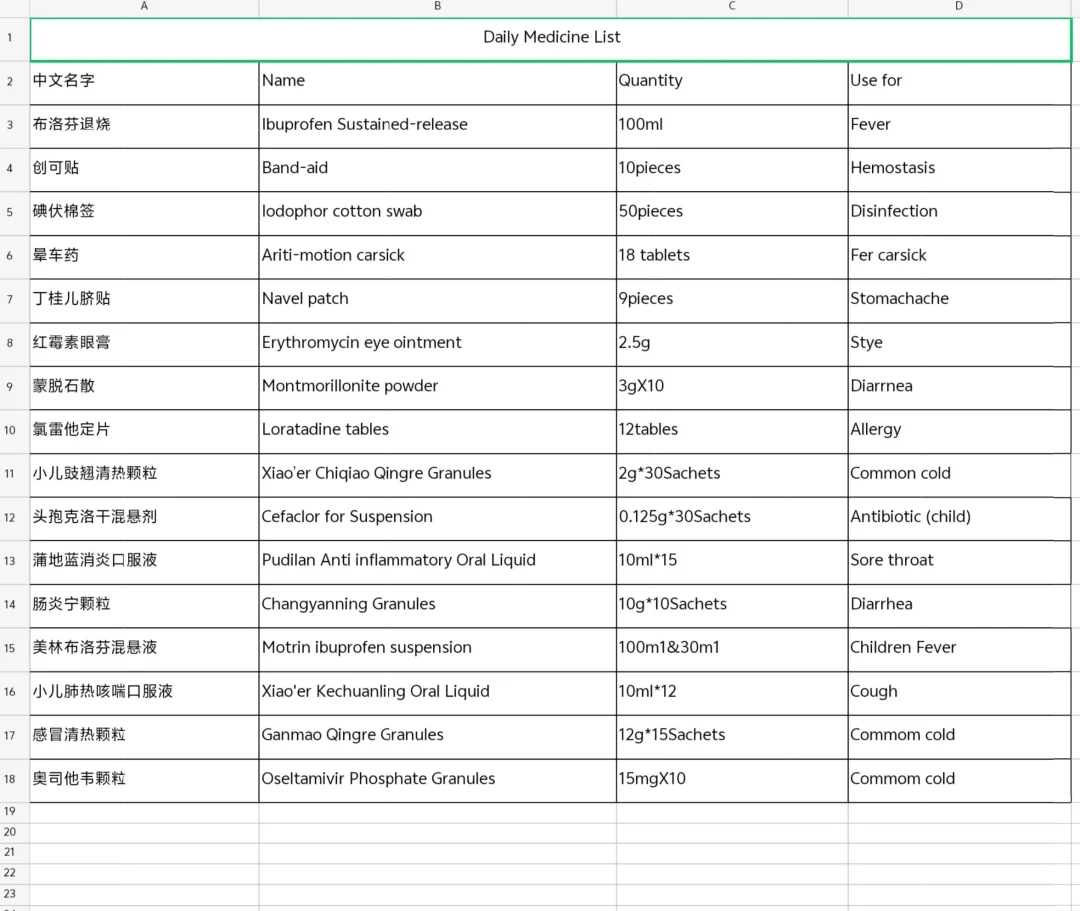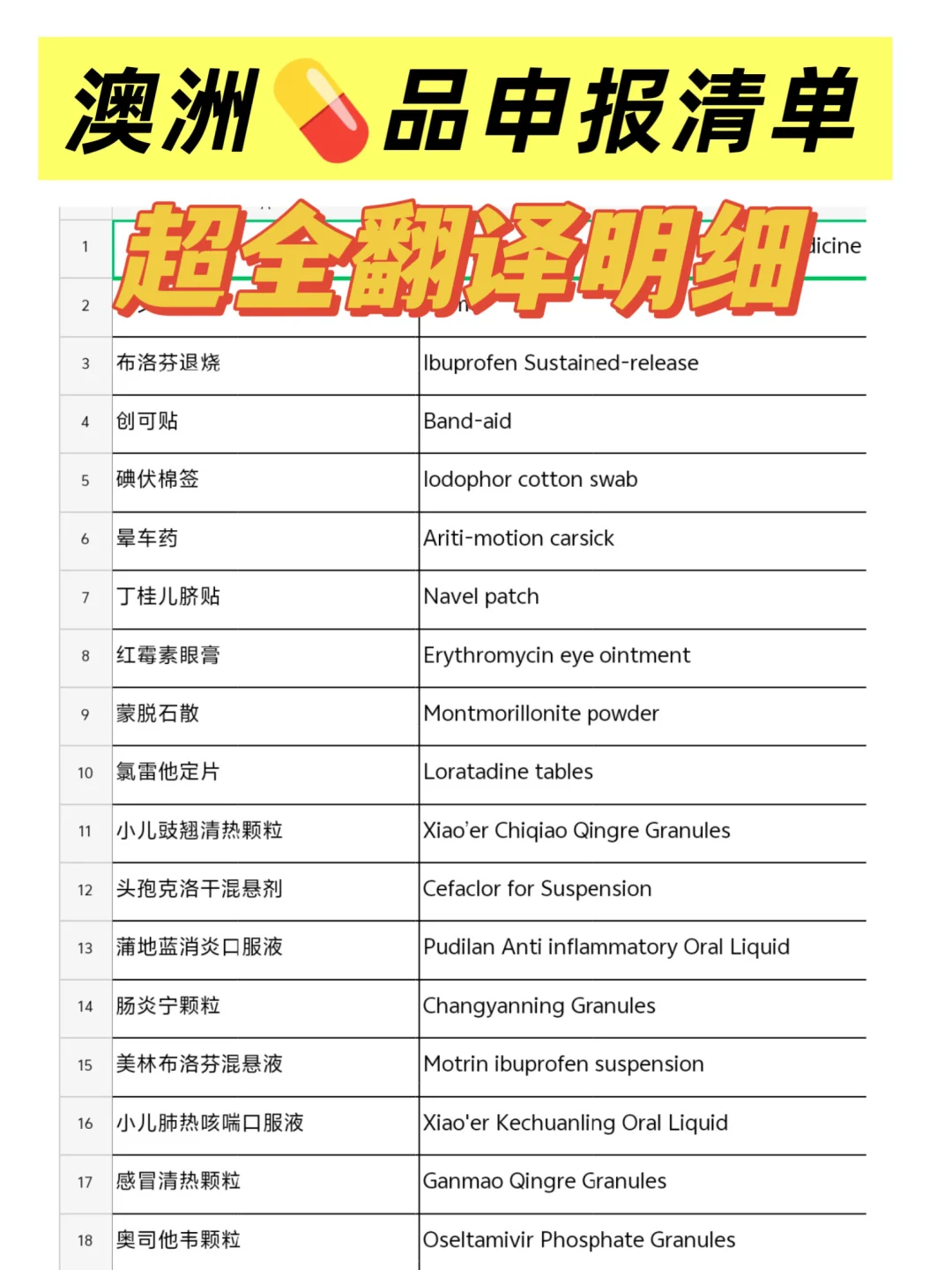 去之前在上搜,发现很多都是错误翻译(有些甚至直接是拼音)或者一些很罕见的药品根本不实用。所以我自己又整理了一版,可以直接打印出来。基本覆盖了日常大部分药品。