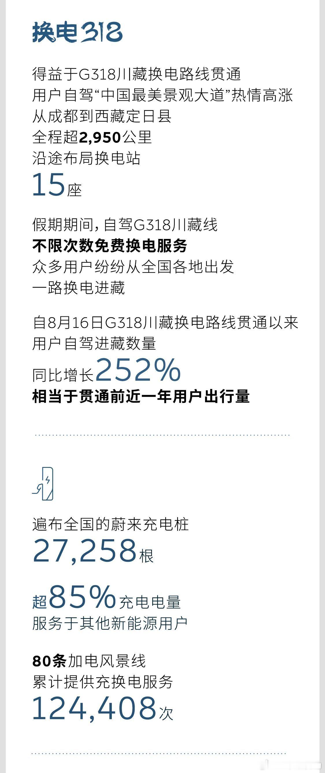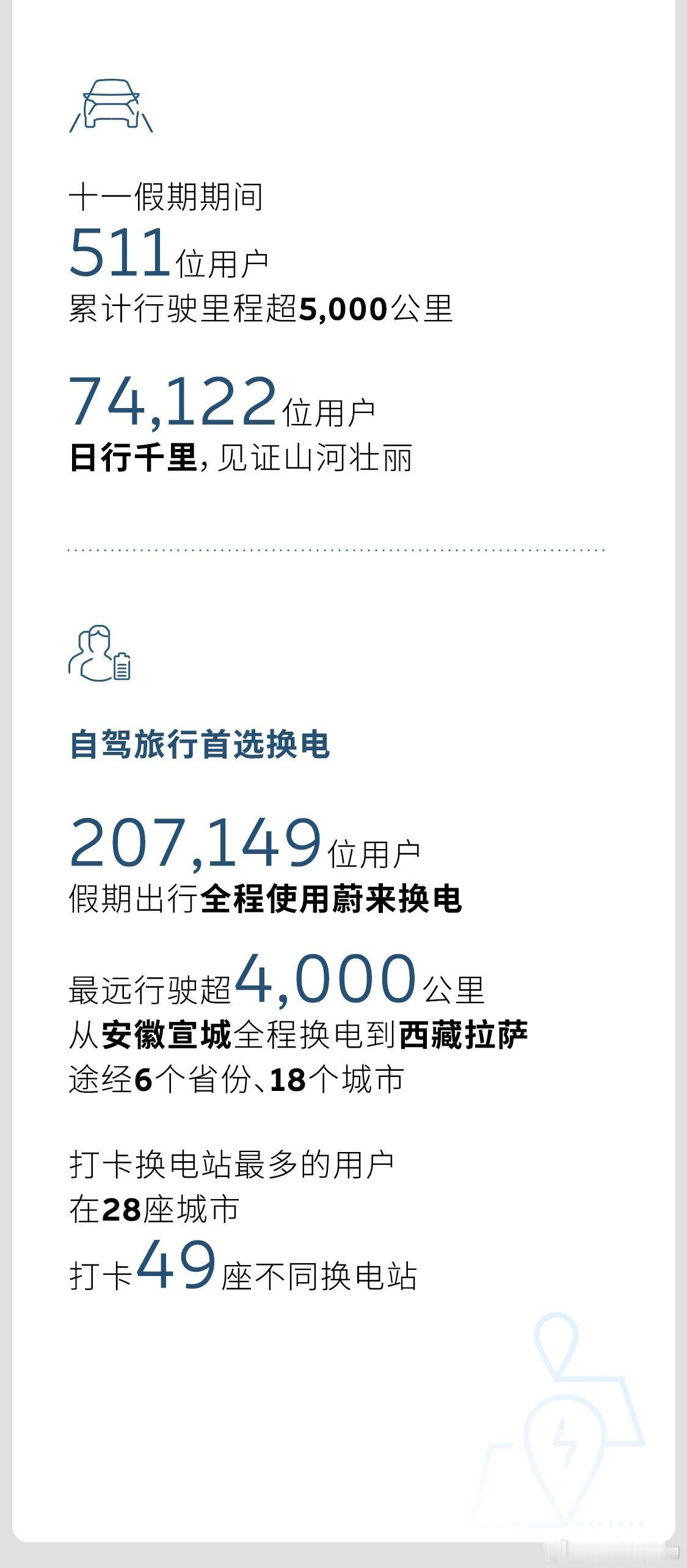 十一期间,蔚来公司用户总行驶里程突破4.9亿公里,其中511位用户行驶里程超过5000公里,超7.4万用户单日行驶里程超过500公里,更有超过20.7万名用户出行全程仅使用换电进行补能。全程换电行程最长的一位用户,从安徽宣城出发自东向西,横跨6省途经18城,全程换电抵达西藏拉萨,行驶里程达4000公里。