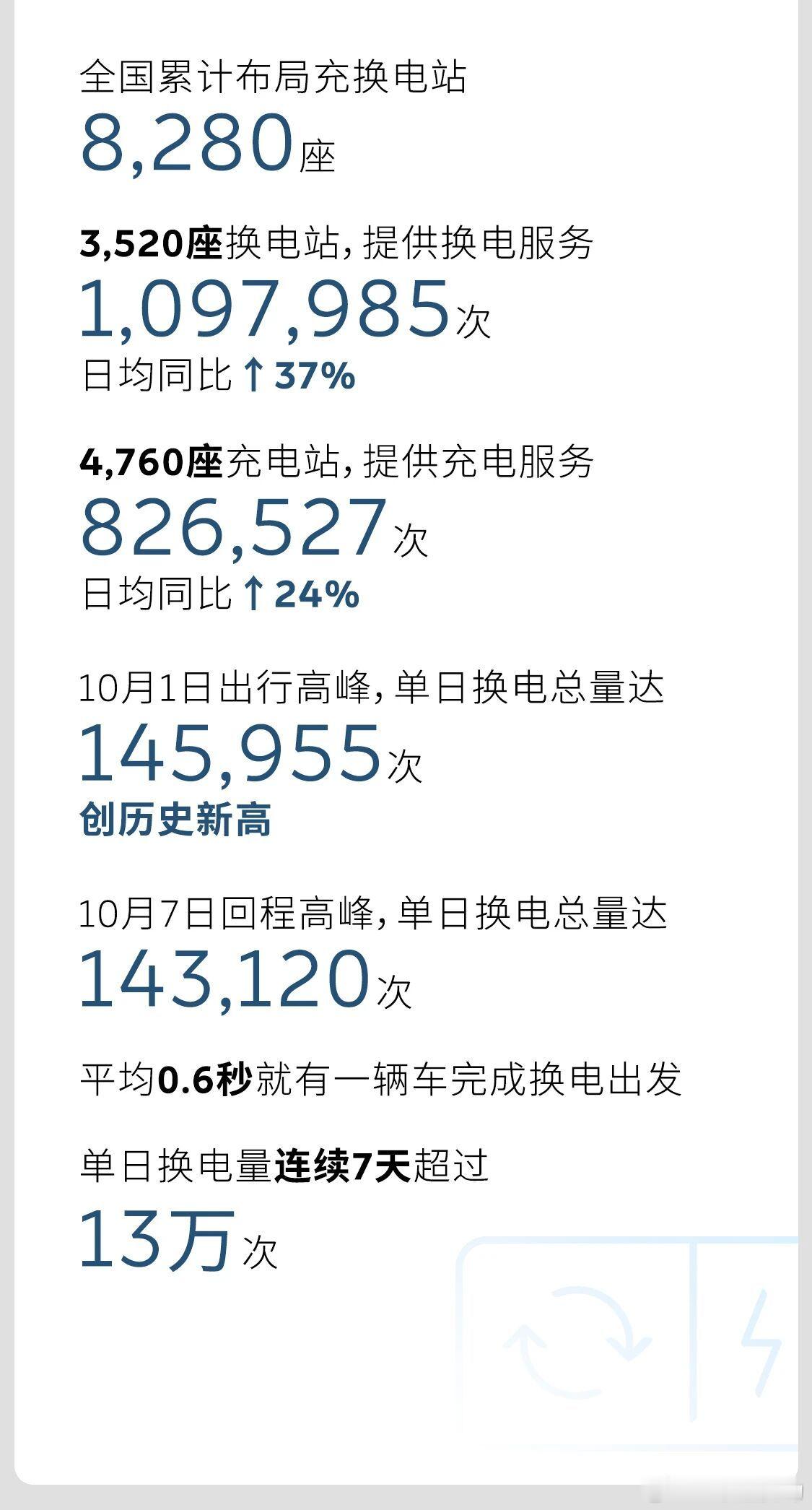 2025年10月9日,蔚来发布《2025十一假期用户加电报告》。十一期间,蔚来能源遍布全国的8280座充换电站,累计为用户提供超192万次充换电服务,其中换电服务达109.8万次,创历史新高;蔚来换电站单日最高服务单量超14.5万,创单日新高;蔚来换电站单日平均服务单量达13.7万次,较2024年同期增长37%。蔚来换电去哪都方便