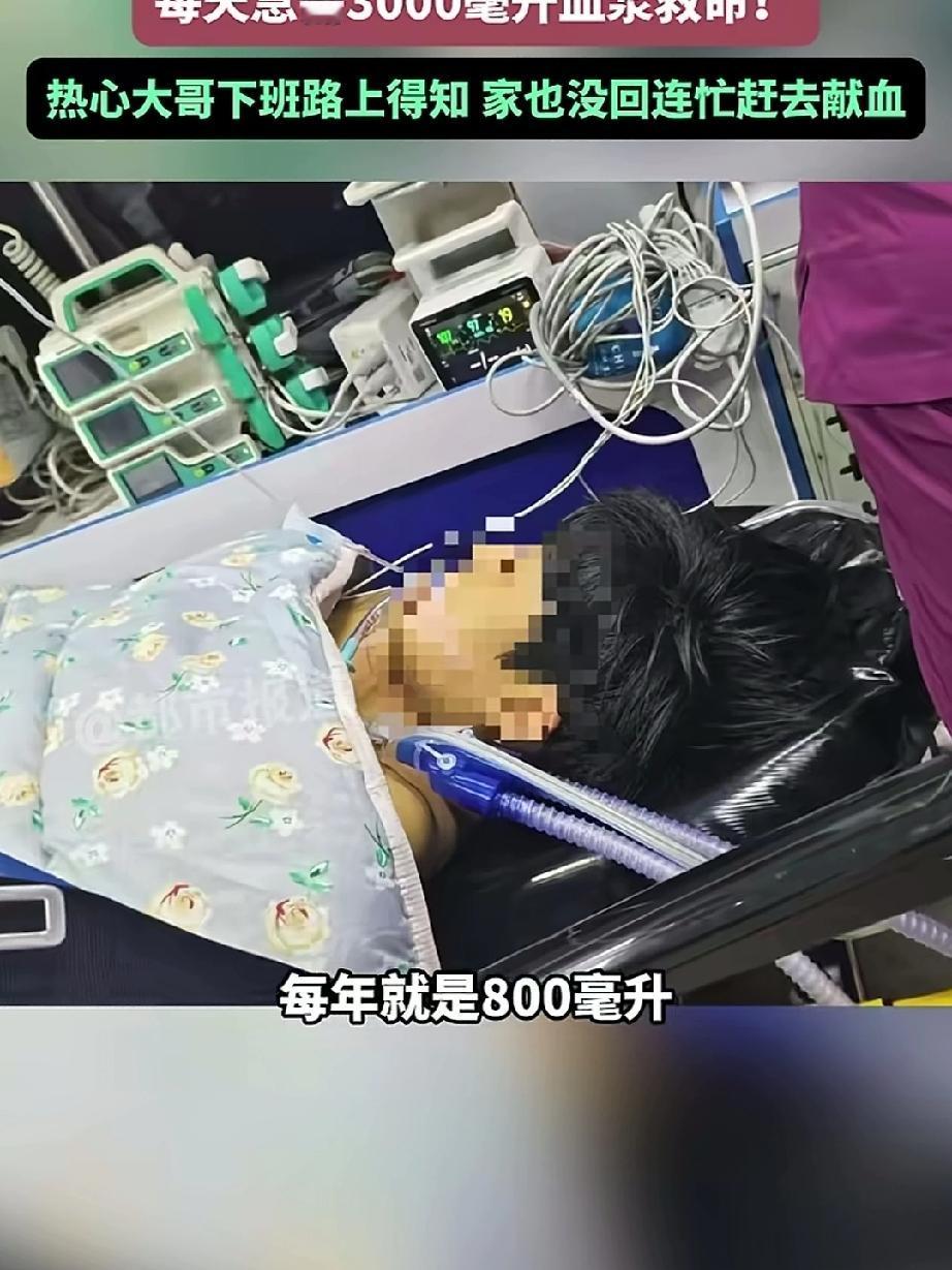 河南郑州一13岁男孩被确诊为急性肝衰竭,每天急需很多毫升血浆救命,热心大哥下班路上得知,家也没回赶紧去献血,就是图中这位热心大哥称:每年献800毫升血,这次正好过了半年能献400毫升,看大哥的笑容就能治愈人心! 孩子才13岁就得这病,每天需要这么多血浆才能保命,热心大哥的热血定会挽救孩子的性命,现在献血的人还多吗?祈盼有更多这样的热心大哥,贡献自己的一份力量来延续孩子的生命!