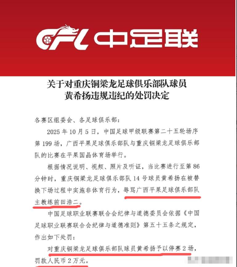 重庆铜梁龙40岁老将黄希扬,因辱骂广西平果日籍教练“八嘎呀路”遭禁赛2场,罚款2