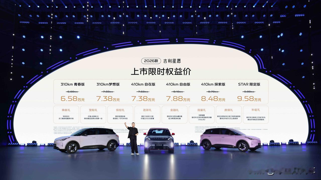 限时售价6.58-9.59万元,加配不加价!2026款吉利星愿正式上市 10月10日,2026款吉利星愿正式上市,新车共推出6款配置,售价区间为6.88-9.88万元,限时售价6.58-9.58万元,现场还推出了吉利星愿STAR限定版,首批限量发售1000台,售价9.58万元。电影《星愿》女主角张柏芝,以吉利星愿全球代言人的身份亲临现场,为吉利星愿助阵。 吉利星愿去年上市至今已售出超40万辆,车辆定位为入门纯电轿车,并配有Flyme Auto智能座舱,采用后置单电机,有58kW和85kW两种动力输出,标配宁德电芯+液冷式温控系统,续航有310km和410km两种版本。悬架部分,这款车使用多连杆后悬架。 吉利星愿是中国汽车品牌交付最快突破40万辆的车型,是2025年全中国全品牌全品类车型的销量冠军,连续4个月销量破4万辆,9月销量破5万辆。 吉利银河全系车型真的是款款皆爆款,成为全球最快达成百万销量的新能源品牌,未来值得期待!
