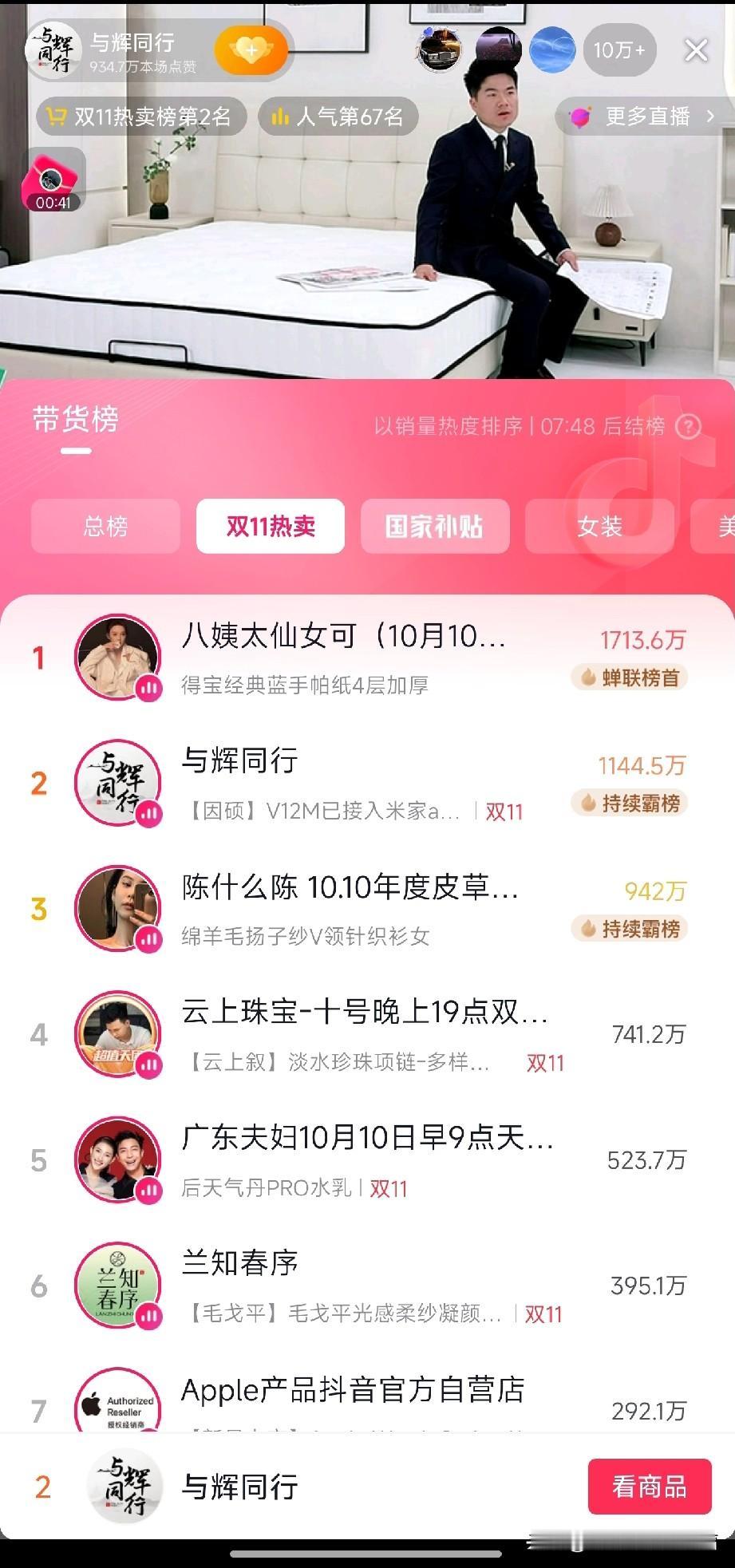 怎么搞的?与辉同行双十一榜第二?还是黄金档董宇辉亲自在直播,十几万人在线,怎么能排第二? 打开榜单“八姨太仙女可”1713.6万位居榜首,不过说实话,对该主播几乎不了解。好了,名次不重要,对消费者来说好的产品才重要。 这款床垫才2000多元,我看了看我花了1万买的一套床体加床垫,从一开始到现在好几年了,不是在修就是在联系售后,最后老板直接在一边装了块木头。不知是床垫还是床的原因,这个床中间鼓,两边塌,就没睡舒服过,早上醒来浑身乏力,又不舍得换,国庆前有一边直接塌了个大坑,商家说国庆假期后过来给我修。[害羞] 我在想如果东方甄选和与辉同行这样真正为消费者考虑的电商早一点出现多好!【侵权必删】