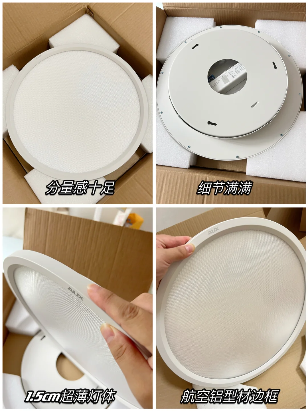 它是航空铝材质,质感很棒,也更耐用了,还有十年质保!防眩菱晶板的设计,直射灯光也不刺眼,重点是厚度只有1.5cm,不压层高。配有遥控器可以调节亮度,色温等,就很方便了~