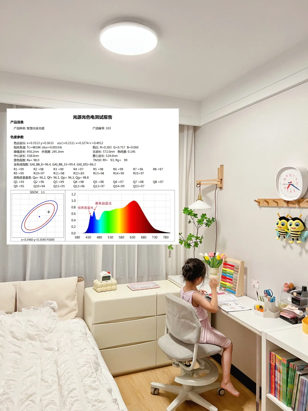 我们都知道,蓝光和频闪对眼睛的伤害非常大。这款全光谱吸顶灯是RG0等级,无蓝光危害(别问我怎么知道的,跟客服拿的光电报告)、无可视频闪,也就避免了在日常生活中的潜在用光隐患哦!