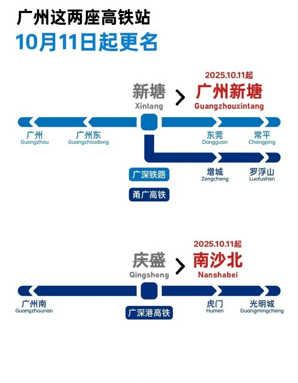 官宣:2025年10月11日起,新塘站将更名为「广州新塘站」,庆盛站将变更为「南沙北站」!这次改名不只是换个站牌,更是城市格局的一次升级✨